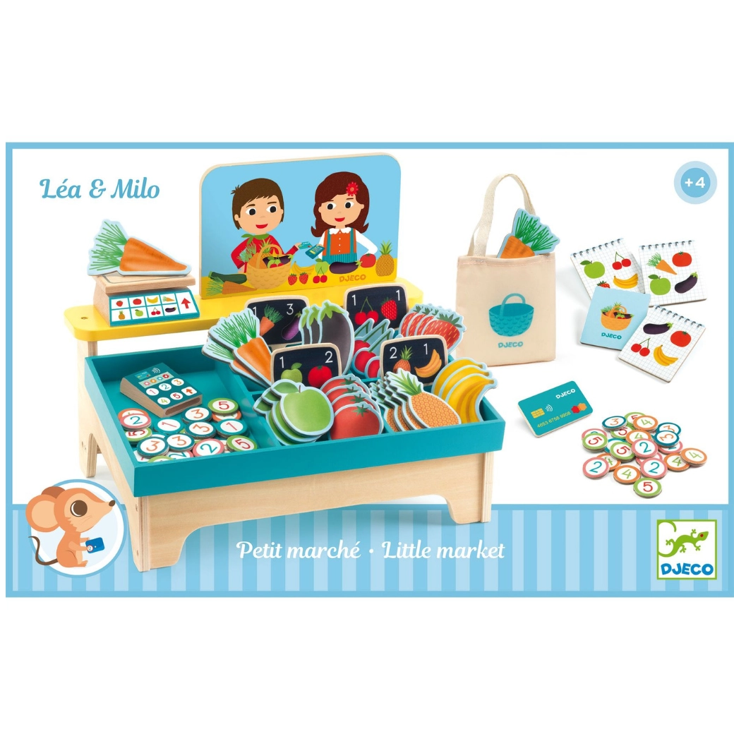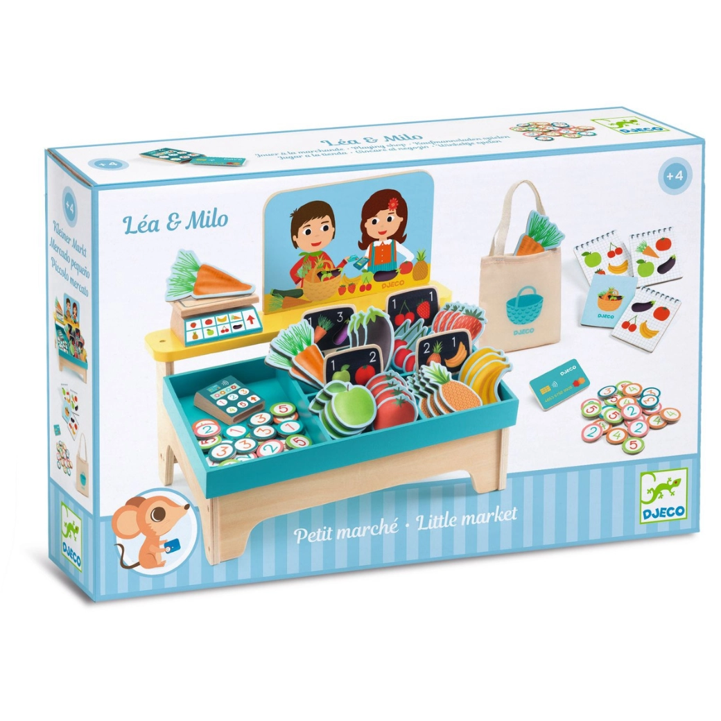 Ontdek de magie van winkeltje spelen met de prachtig uitgewerkte set DJECO kleine winkel Léa & Milo. Kinderen kunnen sorteren, tellen en “verse” producten aanbieden aan klanten, hun woordenschat en fijne motoriek ontwikkelen en een realistische marktsfeer beleven.