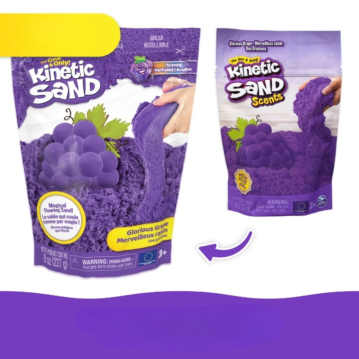 Ontdek het geurende kinetische zand Kinetic Sand Scents met druivenaroma van het merk Spin Master. Het zand voelt als nat aan, maar je handen blijven droog, het droogt nooit uit, het verkruimelt niet en is makkelijk op te ruimen. Perfect voor het maken van vormen en het ontwikkelen van de fijne motoriek van kinderen.
