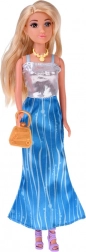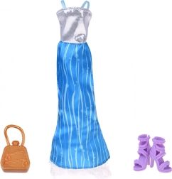 De avondjurk is geïnspireerd op het wateroppervlak – het zilverkleurige lijfje doet denken aan zonreflecties en de lange blauwe rok met golvend patroon roept zeegolven op. De look wordt afgemaakt met pumps met hak, een ketting en een handtas, zodat de prinses of zeemeermin altijd perfect klaar is voor het bal of een onderwateravontuur.
