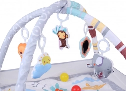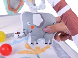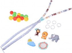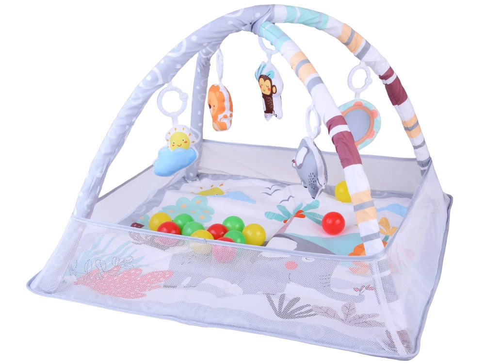 Pluchen diertjes, een zonnetje met wolkje, een babypiegeltje en gekleurde ballen stimuleren zicht, tast en gehoor en moedigen reiken, grijpen en omrollen aan.