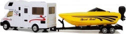 Beleef zomerse avonturen met een realistische set van een caravan en een gele boot op een aanhanger in schaal 1:48. De caravan heeft vliegwielaandrijving – trek hem naar achteren en kijk hoe hij vooruit schiet. Interieurdetails en een afneembare aanhanger met boot stimuleren creatief spel en langdurig plezier voor kinderen vanaf 3 jaar.