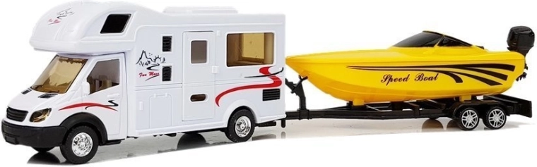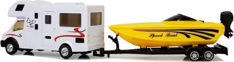 Deze stijlvolle caravan met gele motorboot is ideaal voor kleine chauffeurs en waterratten. Dankzij de vliegwielaandrijving hoef je het voertuig alleen licht naar achteren te trekken en los te laten – het rijdt vanzelf vooruit. Realistische details zoals stoelen en stuur prikkelen de fantasie en bevorderen het vertellen van verhalen.