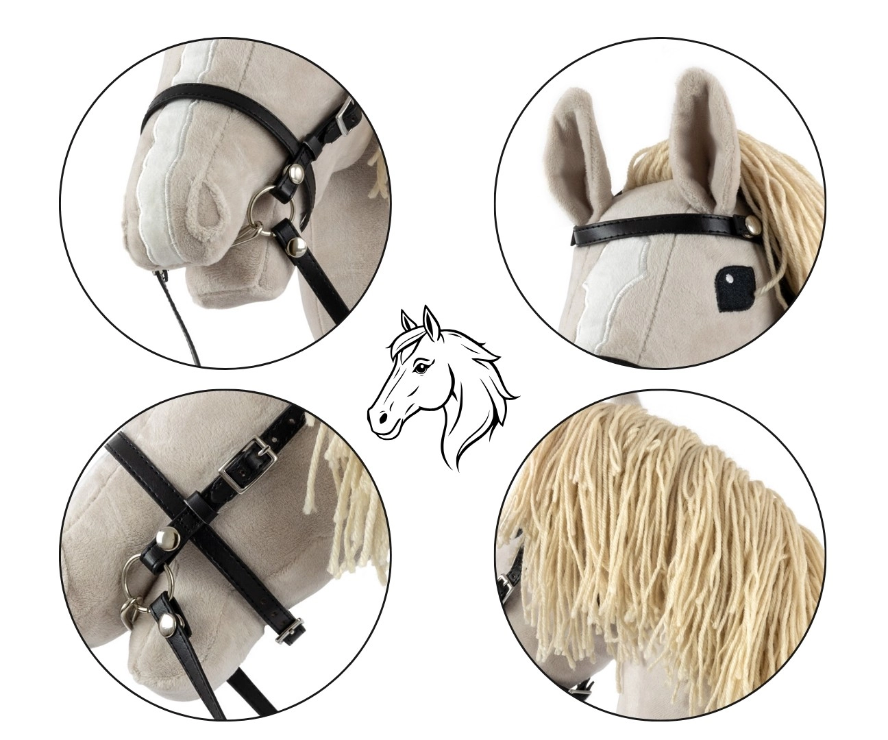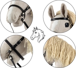 Lange teugels en een hoofdstel helpen kinderen het paardje te leiden en versterken het gevoel van echt rijden.