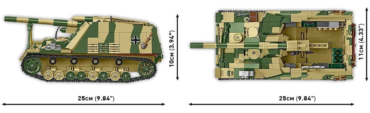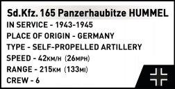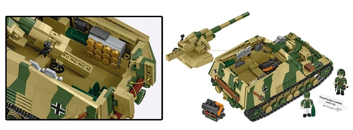 Een authentieke replica van de Duitse zelfrijdende houwitser Panzerhaubitze HUMMEL, gebouwd uit 1118 hoogwaardige COBI-steentjes op schaal 1:28. Dankzij de realistische proporties, de open gevechtsopbouw, de lange loop en het getrouwe onderstel met rupsbanden krijg je een indrukwekkend model voor display en spel. Inclusief een apart tentoon te stellen Maybach HL120 TRM-motor en de mogelijkheid om de 15 cm houwitser sFH 18 (L/30) uit te nemen.