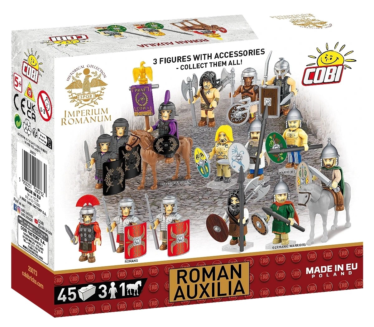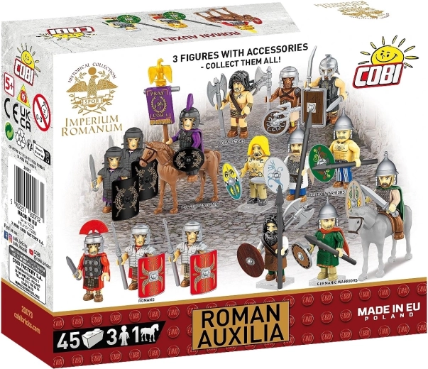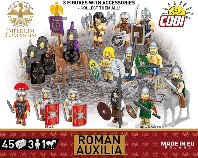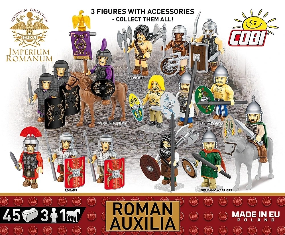 Ontdek de wereld van IMPERIUM ROMANUM met de bouwset ROMAN AUXILIA met 45 onderdelen. Je krijgt 3 gedetailleerde minifiguren (2 infanteristen en 1 ruiter), een paard met zadel en rijk accessoire inclusief nieuwe ovale schilden, prints van lorica hamata en mantels. Kwalitatieve duurzame prints zonder stickers, eenvoudige intuïtieve instructies en compatibiliteit met andere merken maken deze set perfect voor kinderen vanaf 8 jaar en volwassen verzamelaars.