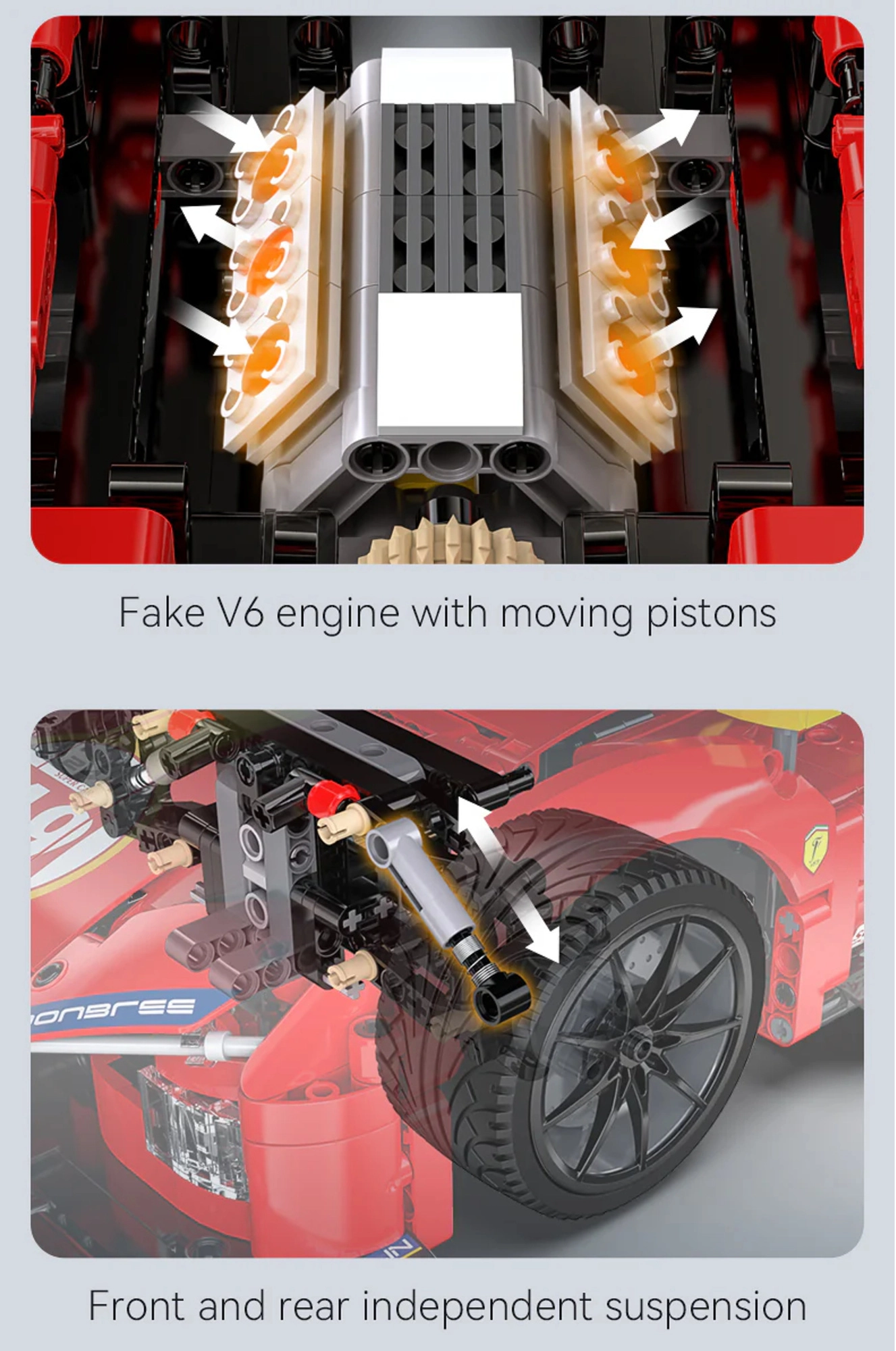 - te openen motorkap en deuren, werkende besturing, stuurbare wielen, onafhankelijke voor- en achtervering, V6-motorreplica met bewegende zuigers, imitatieverlichting