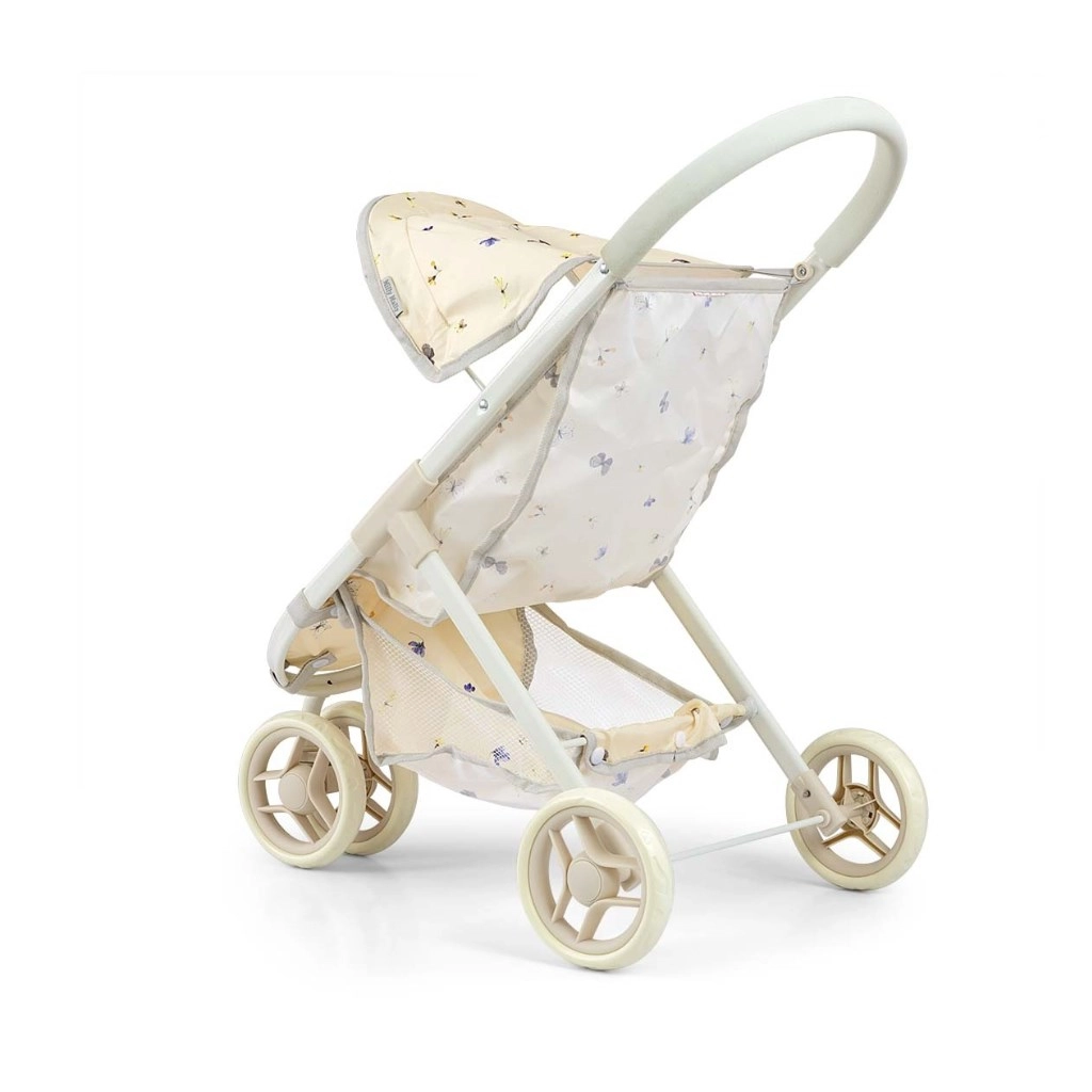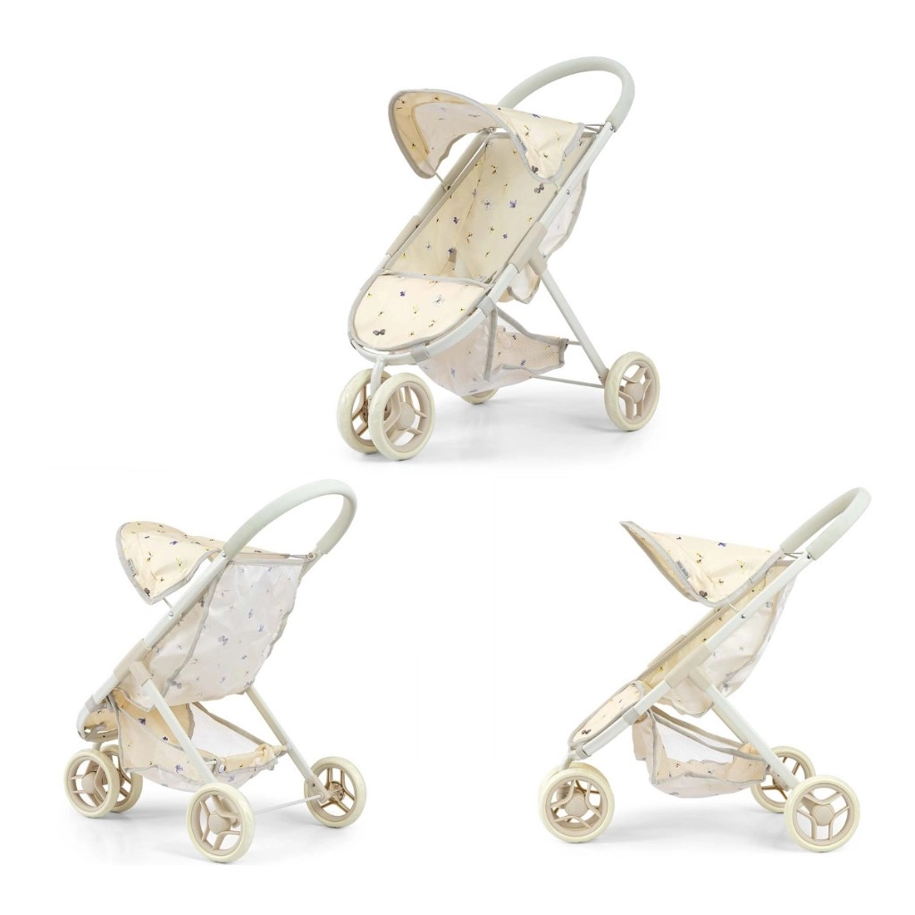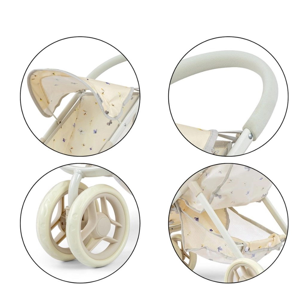 Lichte en stabiele poppenbuggy tot 50 cm met een metalen frame en een zwenkend voorwiel voor eenvoudig manoeuvreren. Voorzien van een inklapbare kap, zachte foam handgrepen en een opbergmand voor accessoires – ideaal voor spelletjes binnen en buiten.