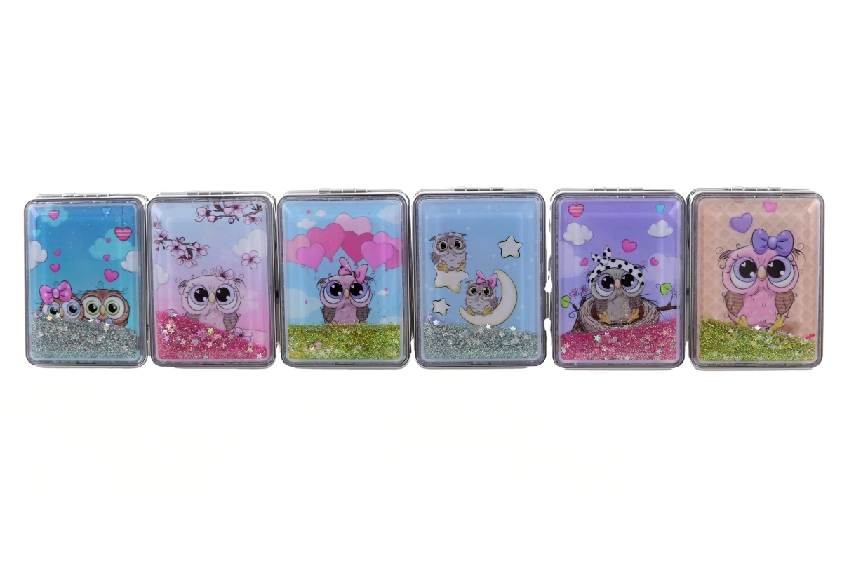 Verwen jezelf met een origineel accessoire voor in je handtas. Deze vierkante zakspiegel met uiltjes biedt niet alleen een schattig design, maar ook een praktische dubbele spiegel voor snelle touch-ups altijd en overal. De voorkant is versierd met bewegende glitters die bij elke beweging zachtjes verschuiven en een opvallend effect creëren.