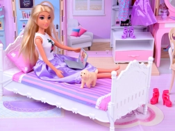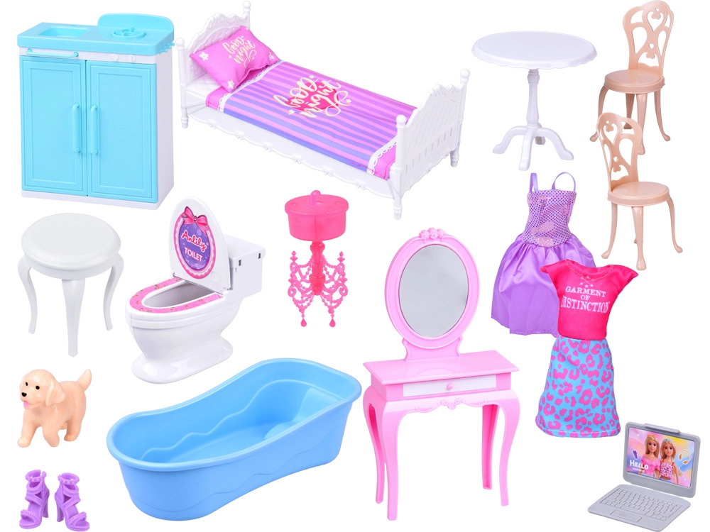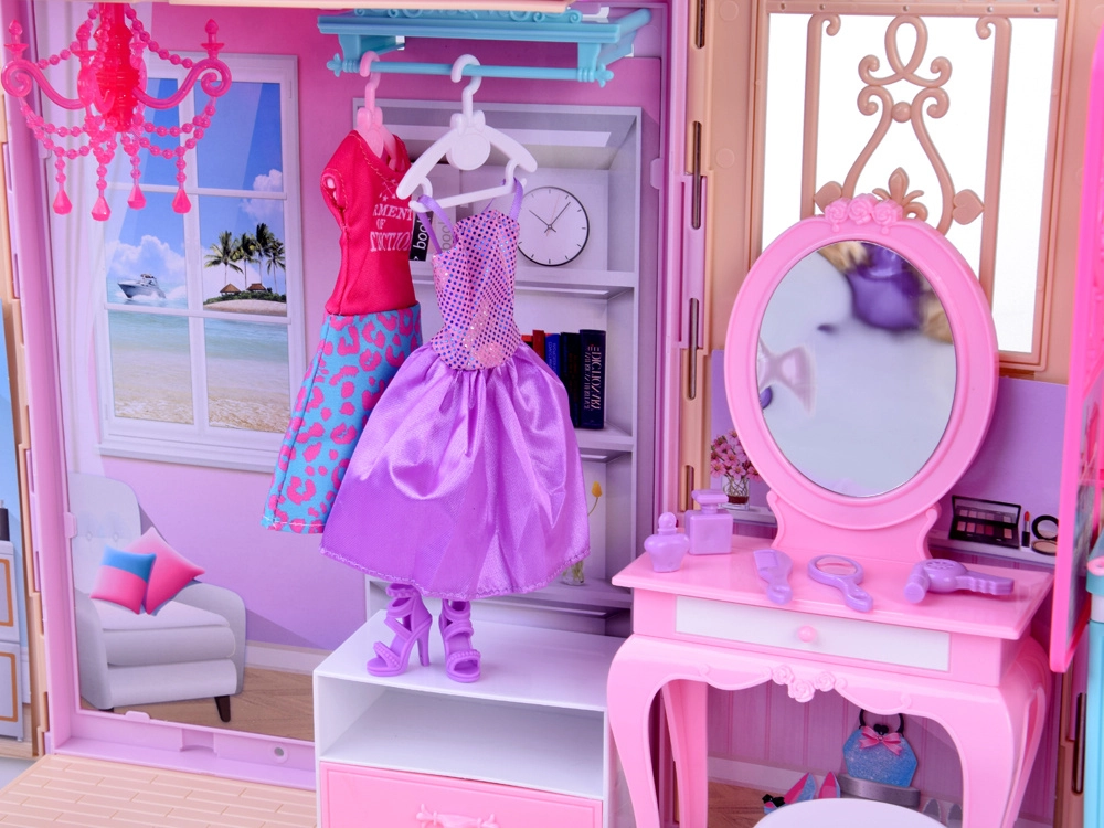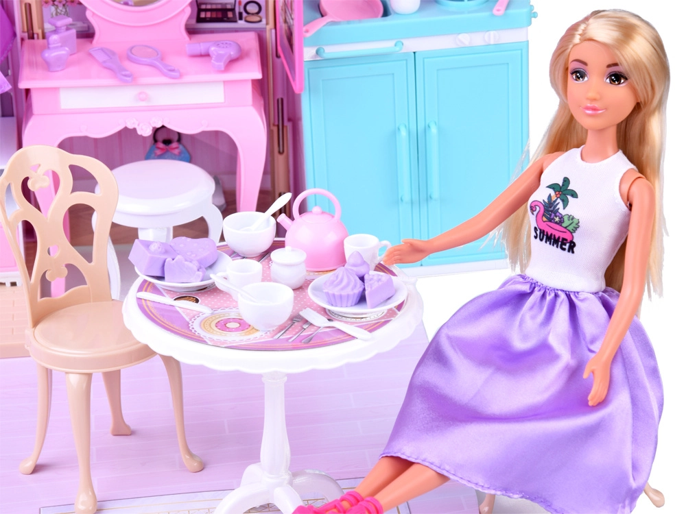 Badkamer, slaapkamer met kaptafel en keuken vormen een compleet thuis voor de pop. Openende deuren, ramen en gedetailleerde decoraties stimuleren de verbeelding en realistisch spelen.