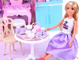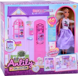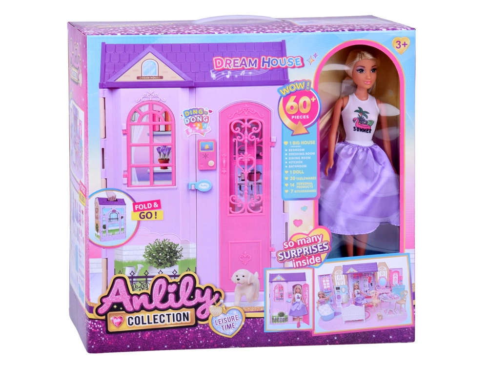 Inclusief de pop ANLILY met lang haar dat ideaal is om te kammen, meubels (bed met beddengoed, kledingkast met lades, kapstok, bad, wc, kaptafel met krukje, eethoek), keukenuitrusting en veel accessoires voor uiterlijke verzorging en koken. Openende deuren en ramen, decoraties en een batterijbel ondersteunen realistisch rollenspel.