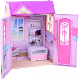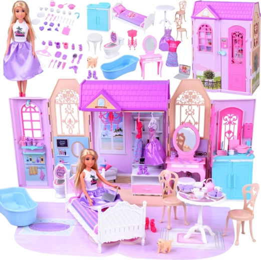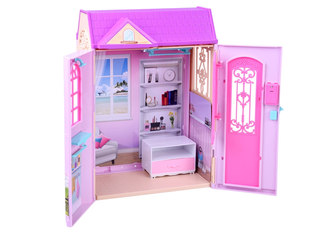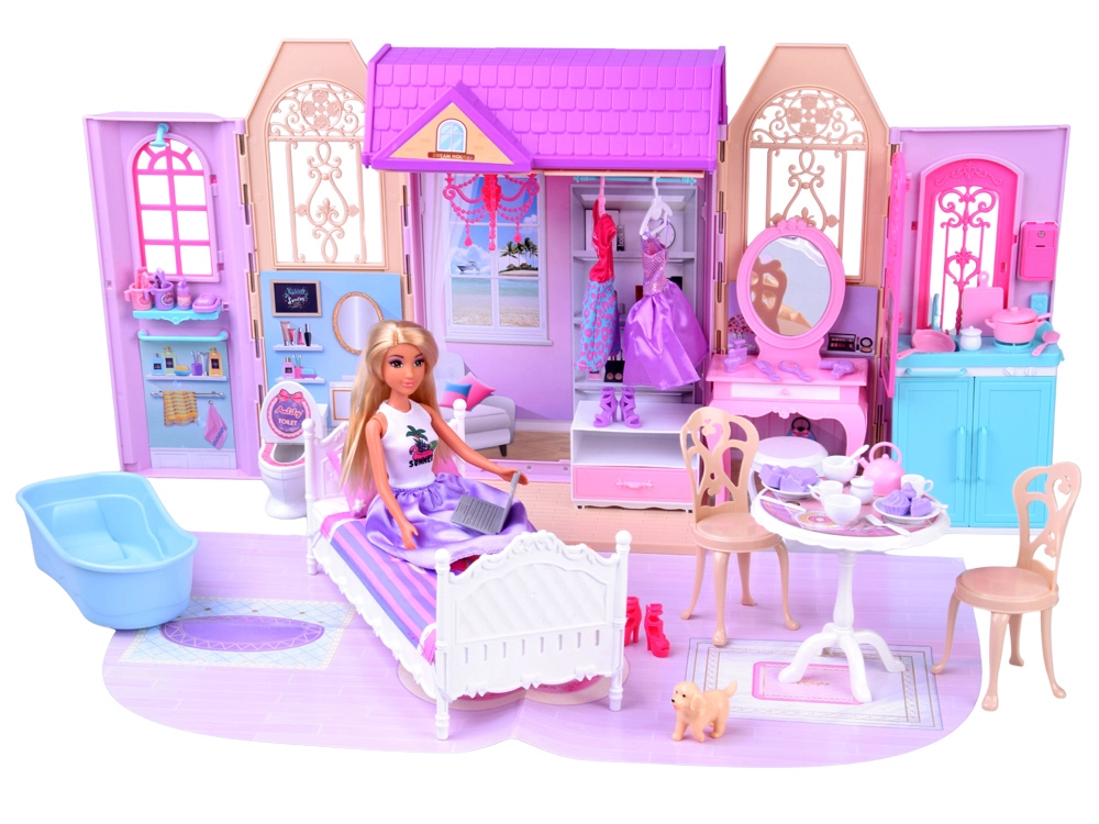 Het opvouwbare roze‑paarse huisje is ontworpen als een praktisch koffertje dat kinderen gemakkelijk meenemen naar de opvang, op vakantie of naar vriendjes. Uitgeklapt ontstaat een knus mini-thuis met drie volledig ingerichte zones: een badkamer voor lange baden, een slaapkamer met kaptafel voor styling en ontspanning en een keuken – het hart van elk huisje.