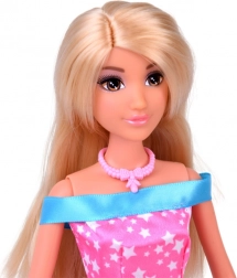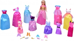 - Pop ca. 30 cm, 11 × jurk, 4 × paar pumps (goud, roze, paars, blauw), 2 × kroon (goud, paars), 3 × ketting (verschillende kleuren), handtas (zilver), scepter (goud)