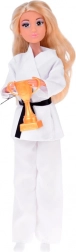 Witte kimono met zwarte band en een gouden trofee voor de winnares. De pop met gewrichten kan zowel vechtposes als het vieren van succes aan.