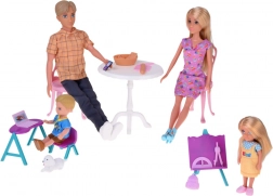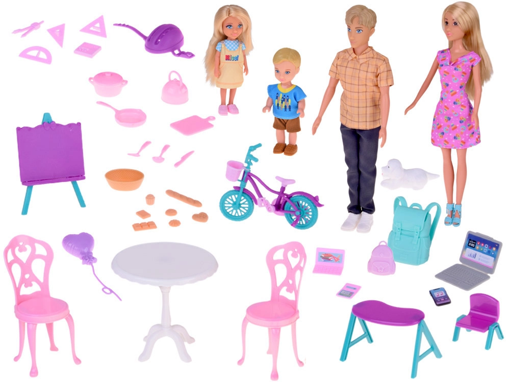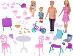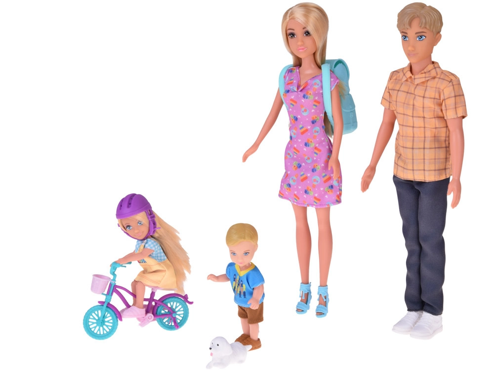 Vier poppen met gedetailleerde kleding en beweegbare gewrichten laten kinderen alledaagse situaties naspelen van ontbijt tot avondontspanning. Inclusief een schattig hondje.