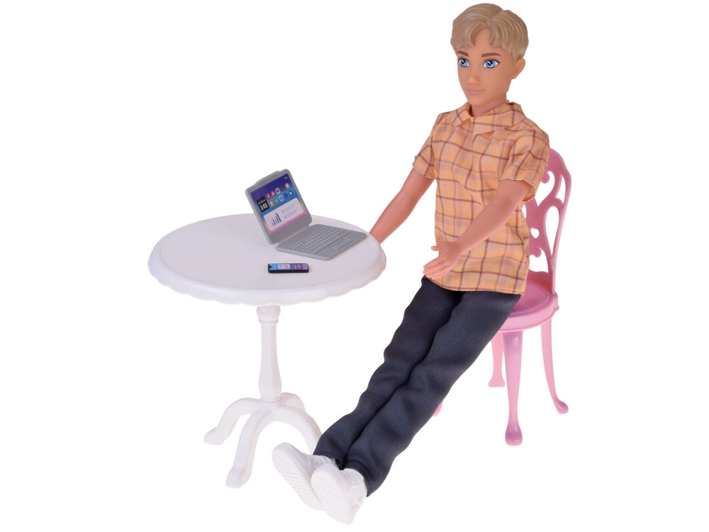 Twee laptops en een smartphone voor werkscènes, een ronde tafel voor samen tijd doorbrengen en een step met helm voor veilig rijden buiten. Alles voor gebalanceerd spel binnen en buiten.