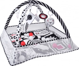 Contrasterende patronen (zwart, wit, rood) helpen baby’s beter scherp te stellen en prikkelen de visuele ontwikkeling. Het zachte oppervlak ondersteunt tummy time, het optillen van het hoofdje en het versterken van nek‑ en rugspieren – belangrijke stappen richting omrollen, kruipen en lopen.