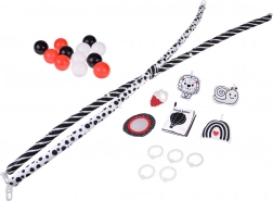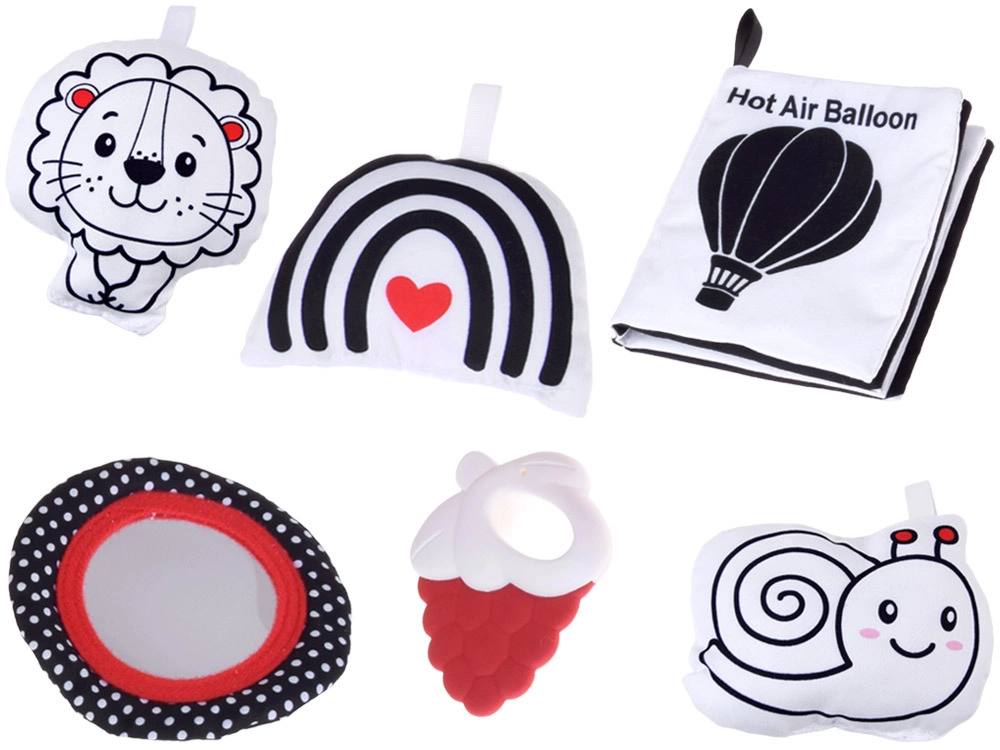 Zwart‑witte patronen met rode accenten ondersteunen scherpstellen, het volgen van beweging en de natuurlijke aandacht van pasgeborenen vanaf de eerste dagen.