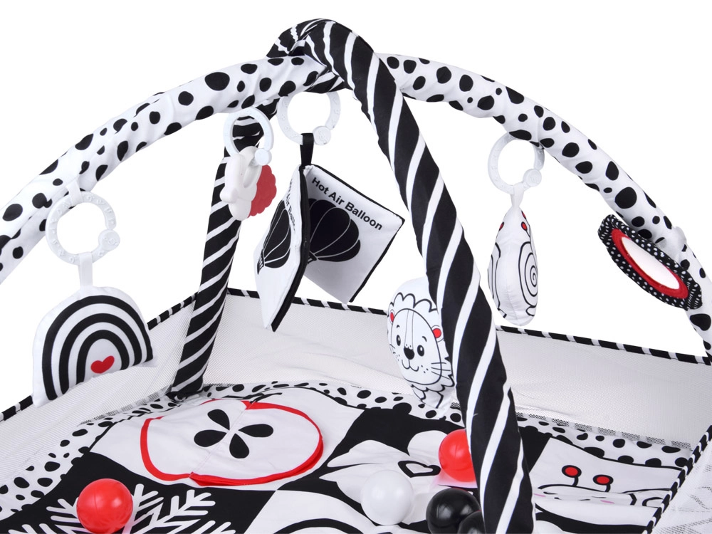 Twee zacht gewatteerde bogen met verschillende hangspeeltjes motiveren tot reiken, grijpen en bewegen. De netzijden veranderen de mat in een handomdraai in een knusse speelrand met ballen voor veilig spelen onder toezicht van volwassenen.