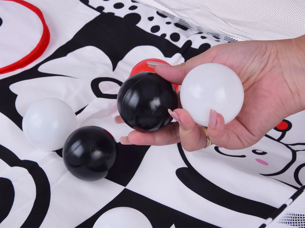 Ademend net houdt het speelgoed binnen en geeft ouders goed zicht. De meegeleverde kunststof ballen veranderen de mat in een leuke mini‑ballenbak.