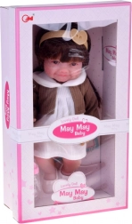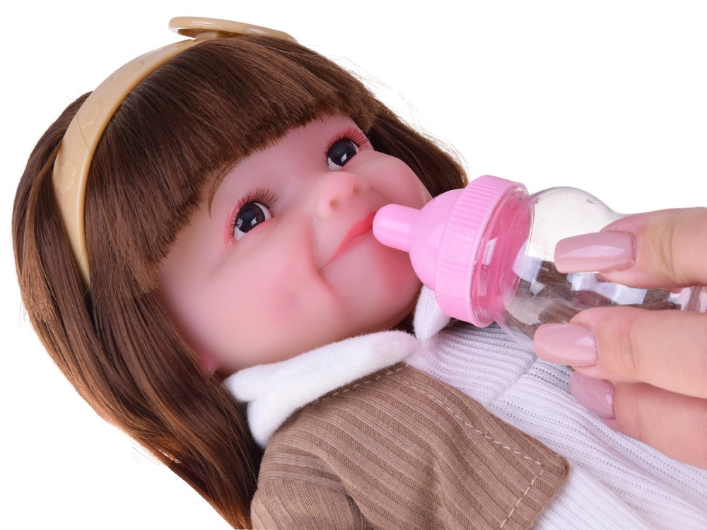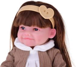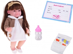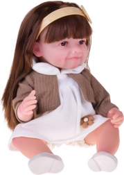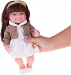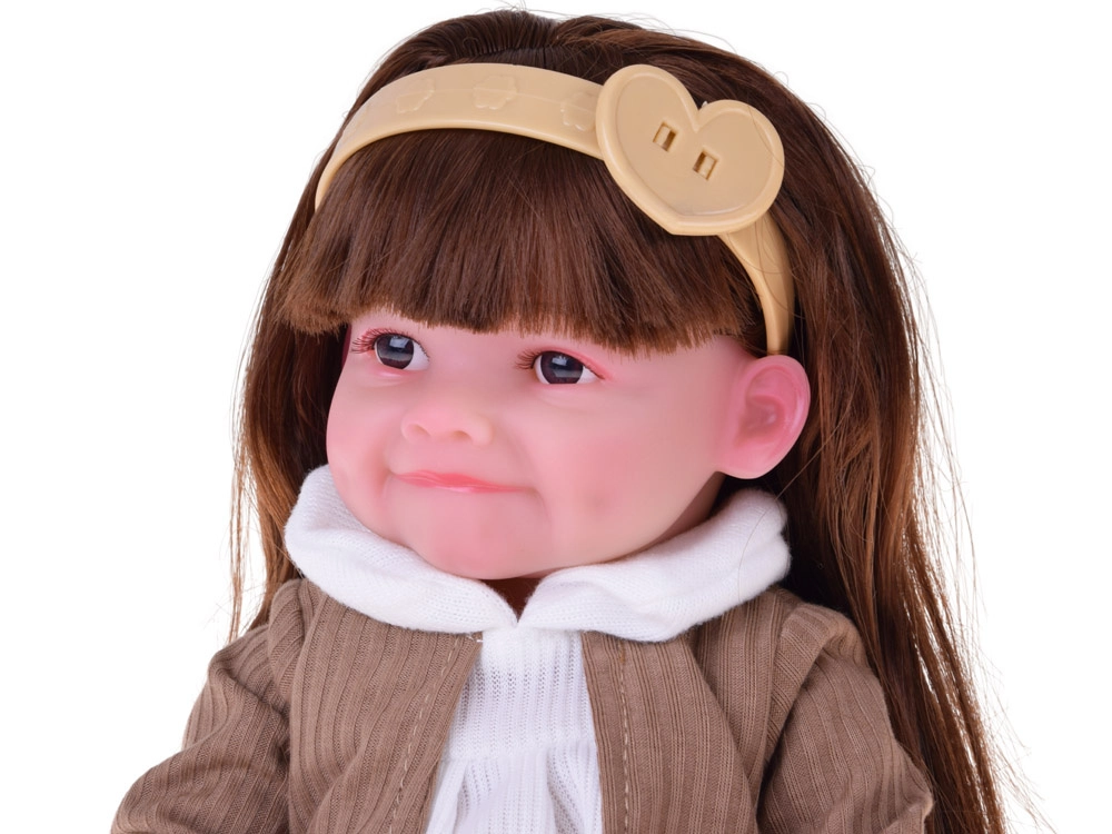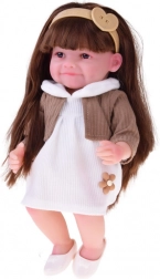 Pop Tosia met een zachte glimlach en lang bruin haar maakt elk kind blij. Ze heeft een zacht, aangenaam aanvoelend lichaam, bewegende ledematen en kan zelfstandig zitten. Inclusief flesje, luier en geboortecertificaat voor realistisch rollenspel. De stijlvolle outfit bestaat uit een wit jurkje, een beige vest, een haarband en afneembare ballerina’s.