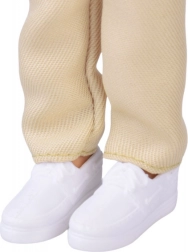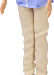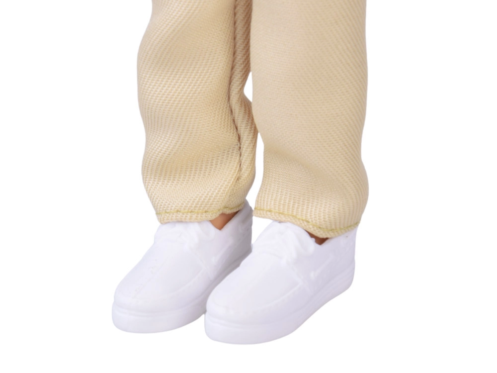 Een elegant overhemd met kraag, lichte broek en witte schoenen geven de pop een moderne look. De kleding kan worden uitgetrokken en gecombineerd.
