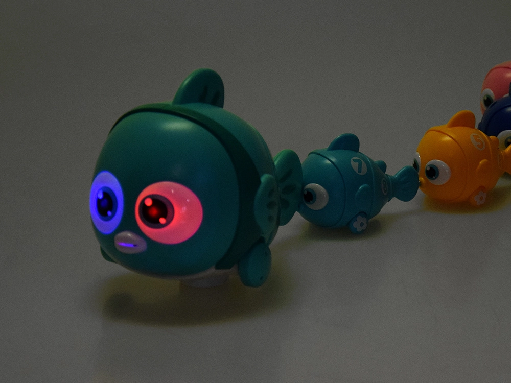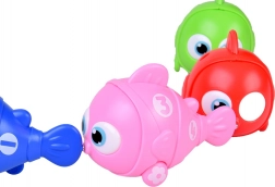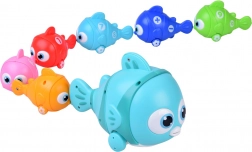 De interactieve vissenfamilie biedt volop speelmogelijkheden thuis en op een gladde vloer. De grote op batterijen werkende vis rijdt na het indrukken van de rugvin naar voren, laat kleurrijke ogen oplichten en speelt een vrolijk deuntje. De kleinere visjes hebben magneten in hun bek en staart, zodat je ze eenvoudig tot een lang treintje kunt koppelen en ze op hun wieltjes achter de grote vis aan kunnen laten rijden.