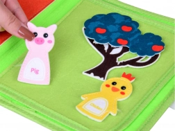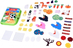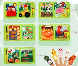 Kinderen leren landbouwhuisdieren, kleuren, vormen en gewassen kennen. Door onderdelen te verplaatsen creëren ze hun eigen scènes en ontwikkelen ze woordenschat en fantasie.