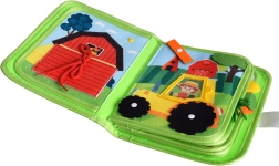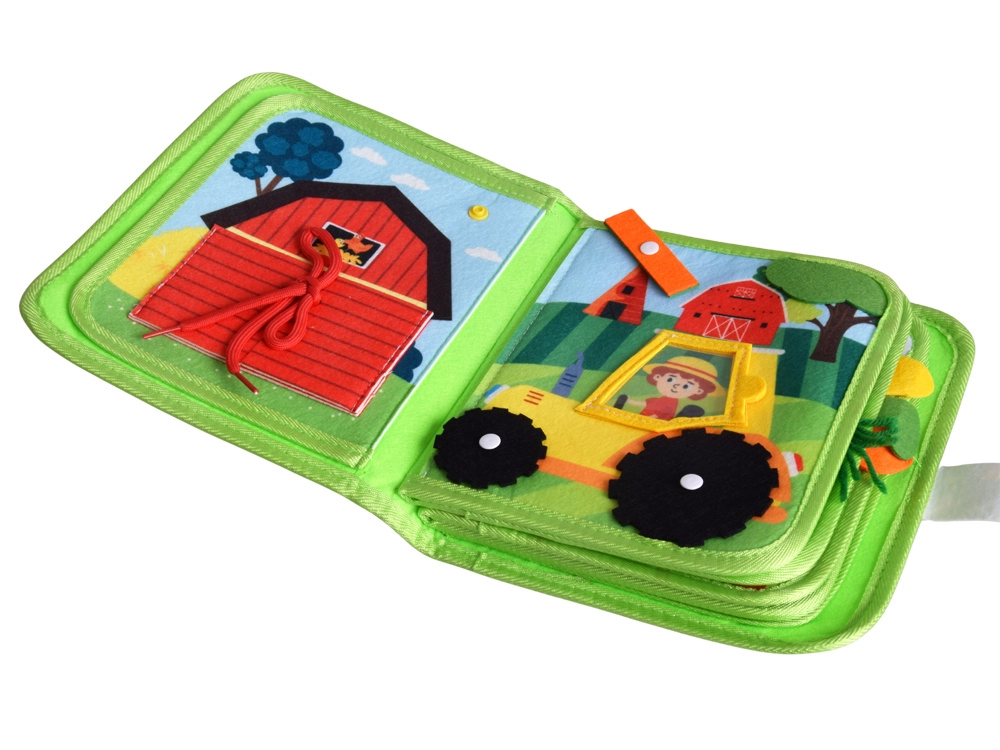 Dit textiele zintuiglijke boekje met boerderijthema zorgt voor uren creatieve speelpret. Op elke pagina wachten dieren, groenten, een tractor en een schuur, die dankzij klittenband verplaatst en gecombineerd kunnen worden. Kinderen kunnen luikjes openen, aan de tractorkolven draaien of een veter strikken en ontdekken wat er allemaal op de boerderij te zien is.