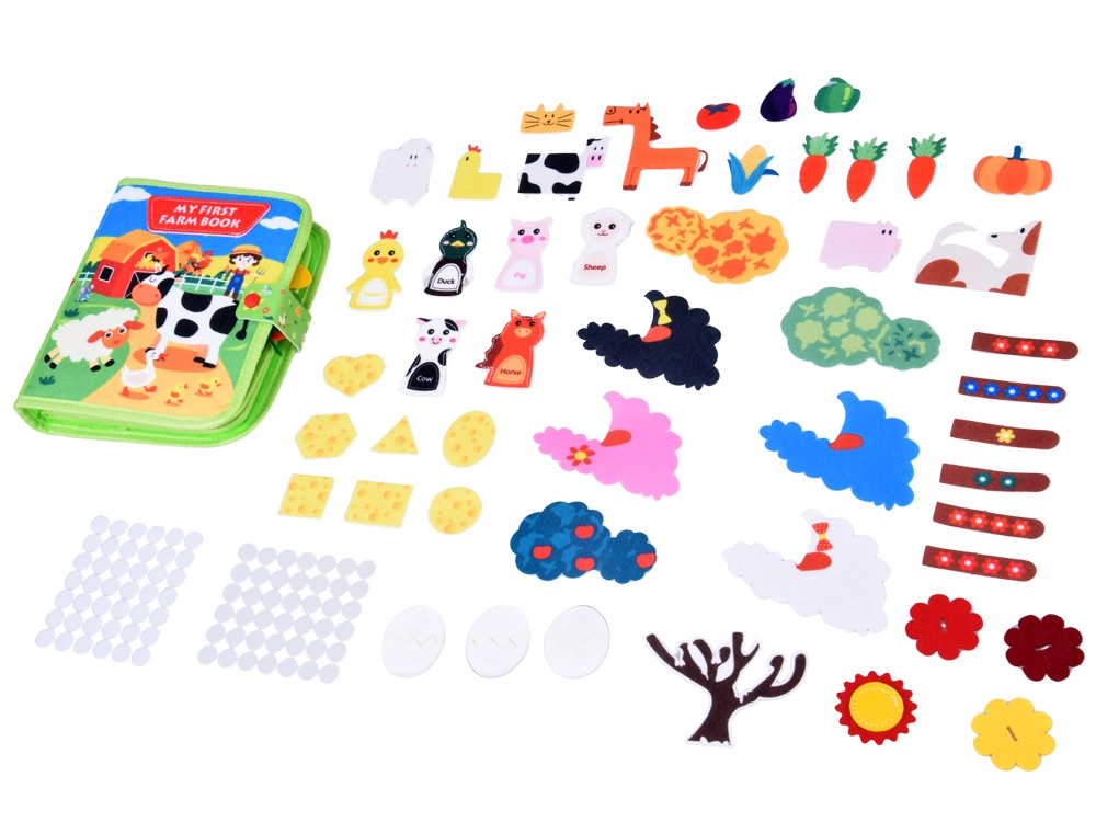 - textiel quiet book met boerderijpagina’s en vilten onderdelen met klittenband