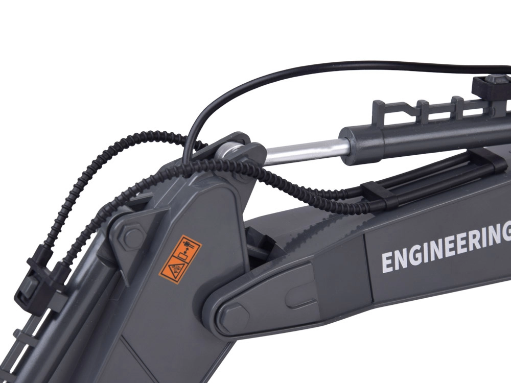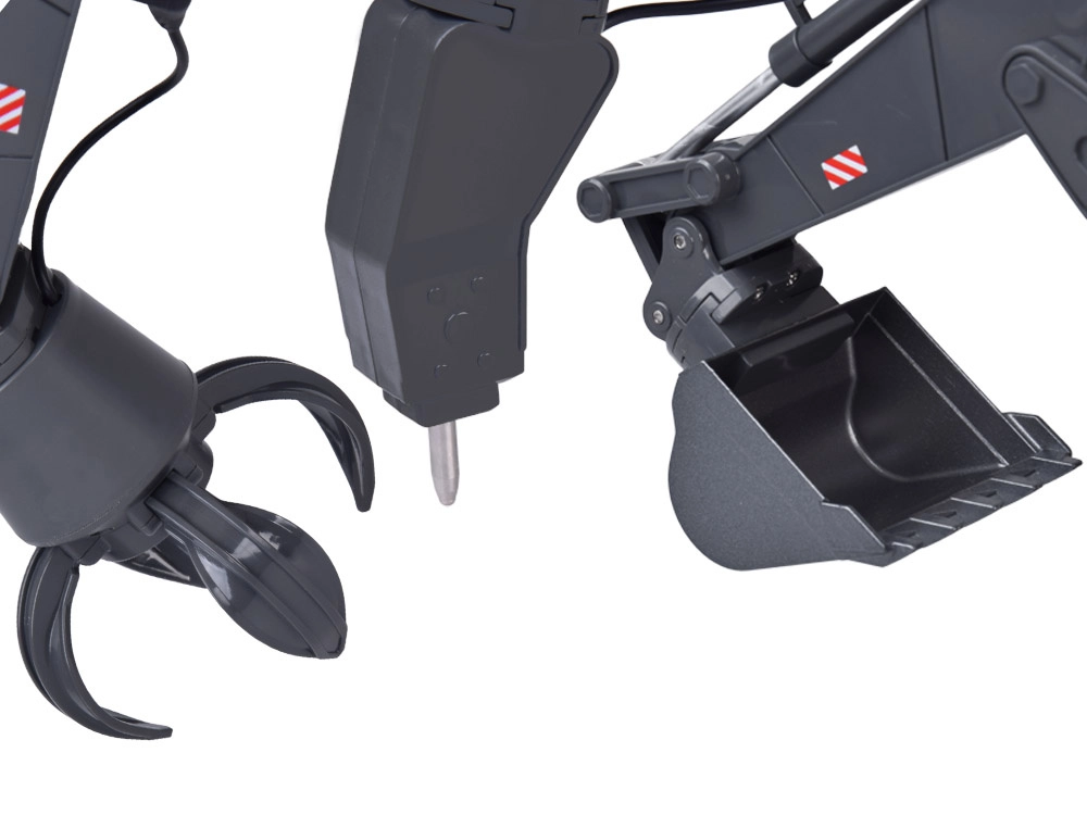 Er zijn drie verwisselbare opzetstukken – schep, grijper en sloop hamer – waarmee je de graafmachine eenvoudig aanpast aan diverse taken. LED-verlichting en geluidseffecten zijn eenvoudig in- of uit te schakelen. Een metalen schep, kunststof cabine en robuuste afwerking beloven langdurig speelplezier.