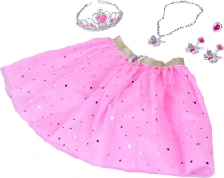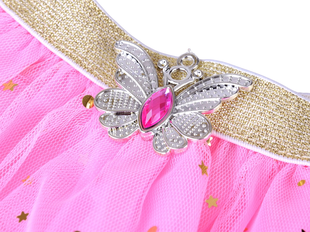Prikkel de fantasie van je kind met deze betoverende verkleedset: een roze glinsterende rok met een gouden elastische tailleband, een zilverkleurige kroon met roze steentjes, een vlinderhangerketting, een ring en vlinderoorbellen. Ideaal voor sprookjesspelletjes, verjaardagsfeestjes en carnaval.