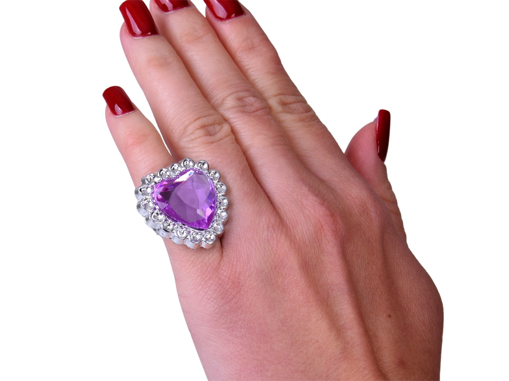De set bevat een ketting met een grote paarse steen, hangende oorbellen en een opvallende ring – alles in een uniforme, betoverende stijl.