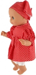 De opvallende rode jurk met witte stippen en de bijpassende sjaal geven de pop een charmante retro look.