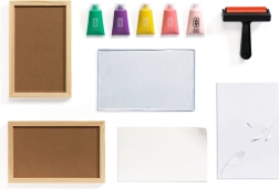 Praktisch samengestelde set met een gelplaat, roller, vijf kleuren en papier, zodat je direct na het uitpakken kunt beginnen.