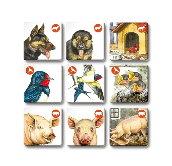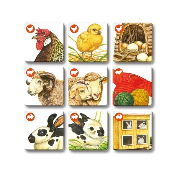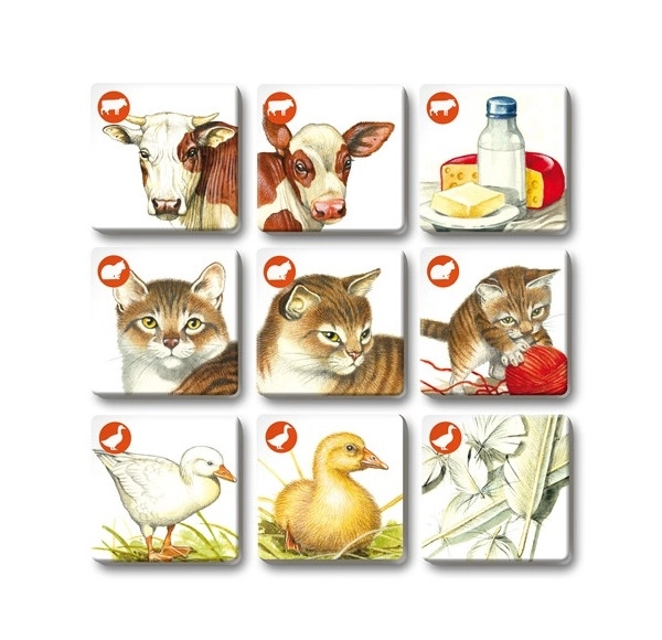 Gedetailleerde, realistische afbeeldingen op stevige vierkante kaarten maken onthouden makkelijker en nodigen uit om keer op keer te spelen.