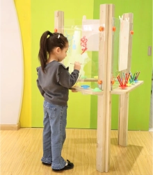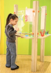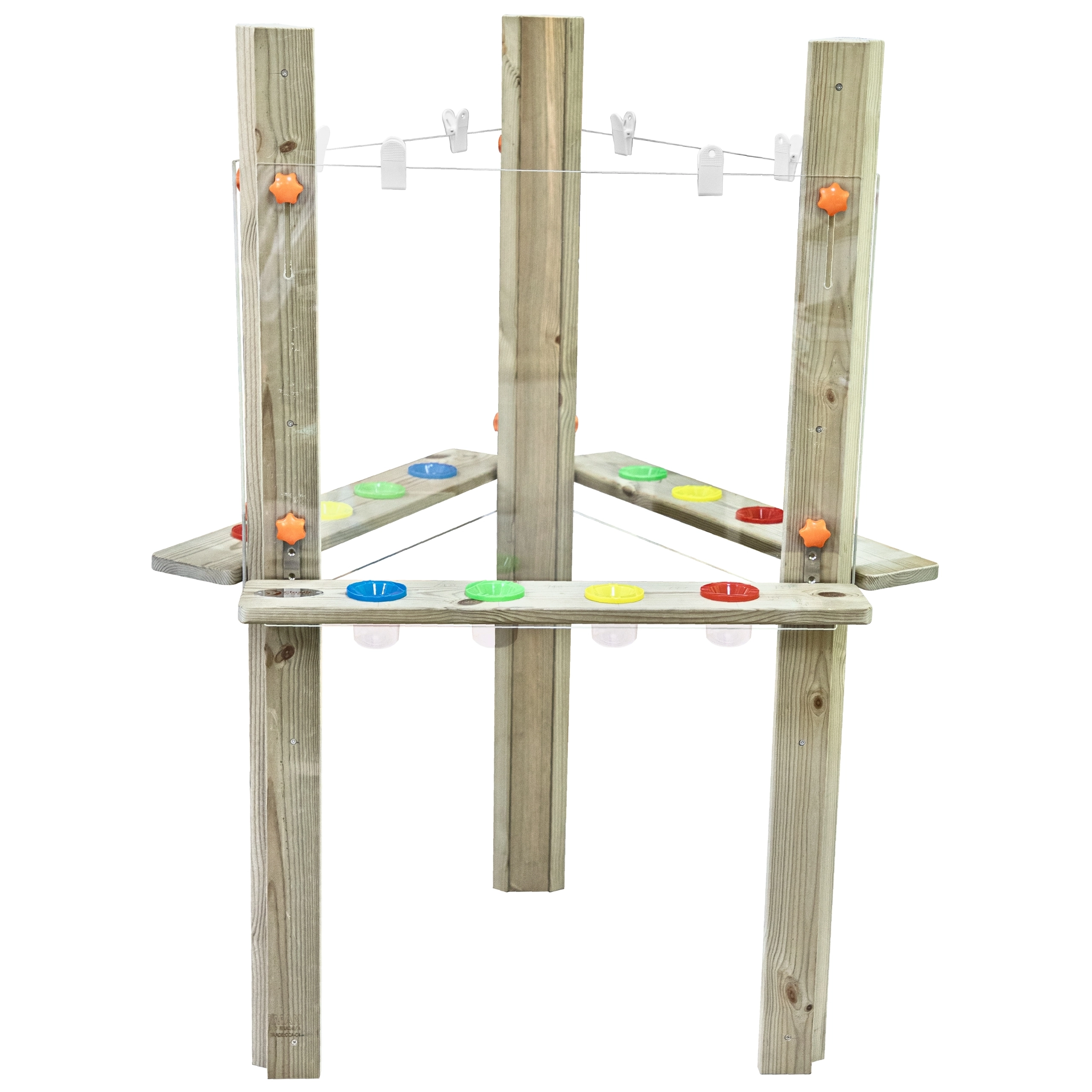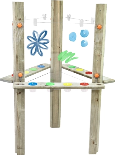 Dit robuuste creatieve station voor buiten en binnen laat kinderen rechtstreeks op de transparante panelen schilderen of op papier dat met klemmen is vastgezet. Dankzij de driehoekige voet kunnen drie kinderen gelijktijdig comfortabel werken zonder elkaar te hinderen. De heldere acrylplaten zijn eenvoudig te reinigen, wat tijd en materiaal bespaart.