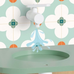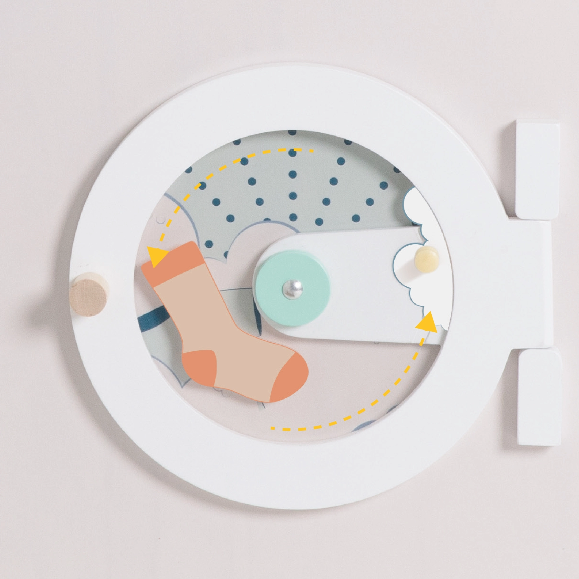 De ingebouwde “wasmachine” met rond raampje en bedieningselementen breidt de spelthema’s uit – van wassen tot sorteren van was en zorg voor het huishouden.