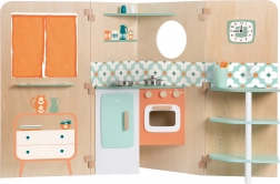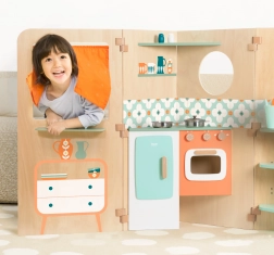 Het huisje klapt eenvoudig uit tot speelzones en is net zo makkelijk weer op te vouwen tot een compact formaat, ideaal voor kleinere kamers. Een rijke set accessoires (pannen, kopjes, bestek, zout en peper) stimuleert rollenspel, sociale interactie en vaardigheidsontwikkeling.