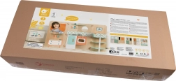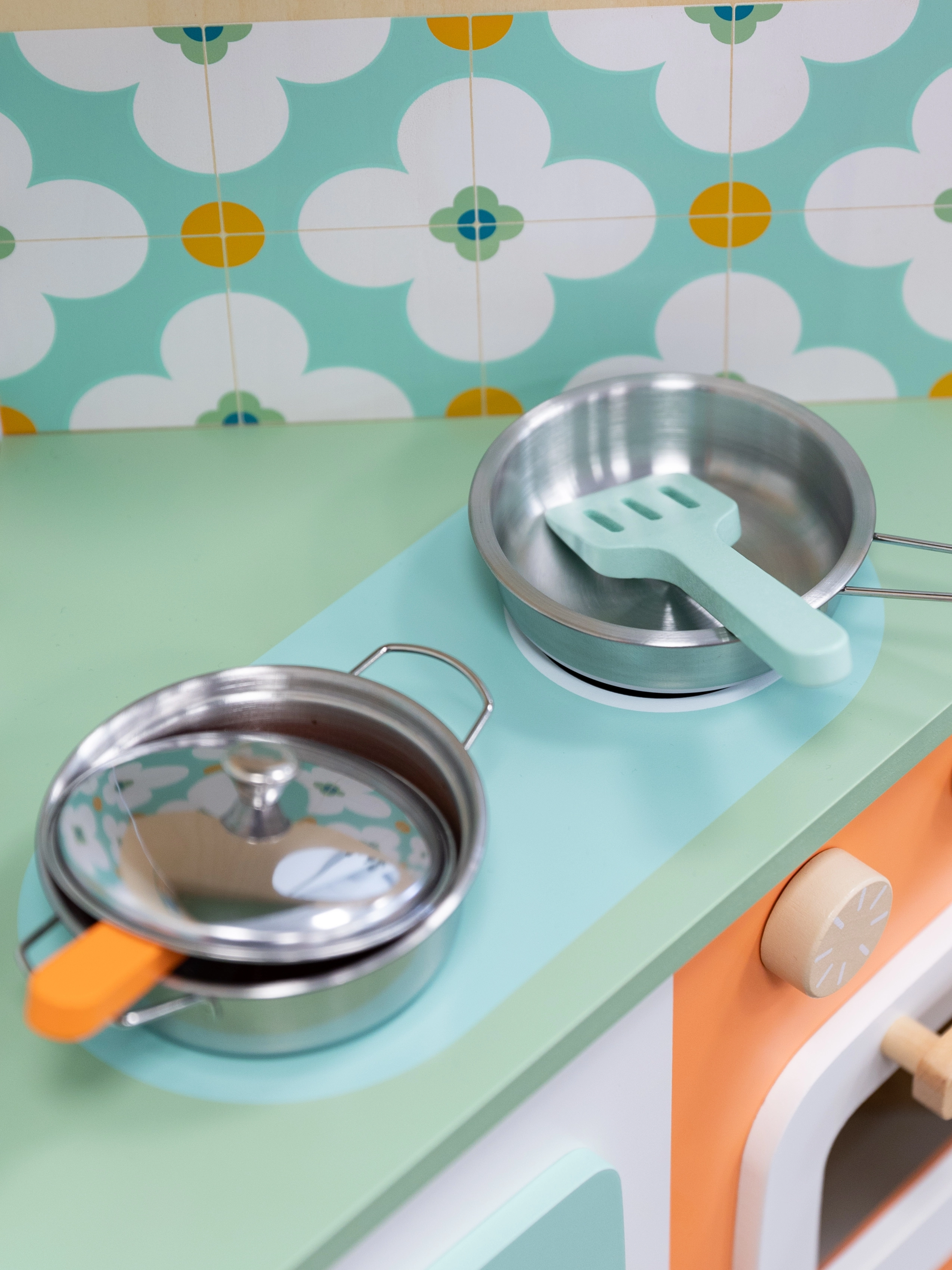 Kinderen kunnen “koken”, bakken en bedienen aan het loket. Openende deurtjes, draaiknoppen en plankjes ondersteunen realistisch spel en het organiseren van accessoires.