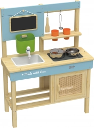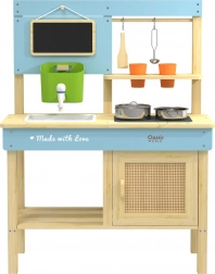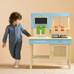 Deze hoogwaardige kinderkeuken is gemaakt van natuurlijk gecertificeerd hout en ontworpen zonder scherpe randen voor veilig spel vanaf 3 jaar. Dankzij de duurzame constructie en slimme indeling met haakjes en planken kunnen kinderen servies en keukengerei eenvoudig opbergen. Het kleine krijtbordje dient als menu of takenlijst – een beetje krijt en de fantasie gaat volop aan het werk.