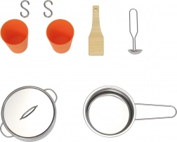 In de doos: pannen met deksels, 2 bekers, een spatel, een lepel, ophanghaakjes, een krijtbordje en de basisuitrusting van de keuken (spoelbak, kookplaten, planken). Een perfecte keuze voor buiten én binnen voor kleine chefs.