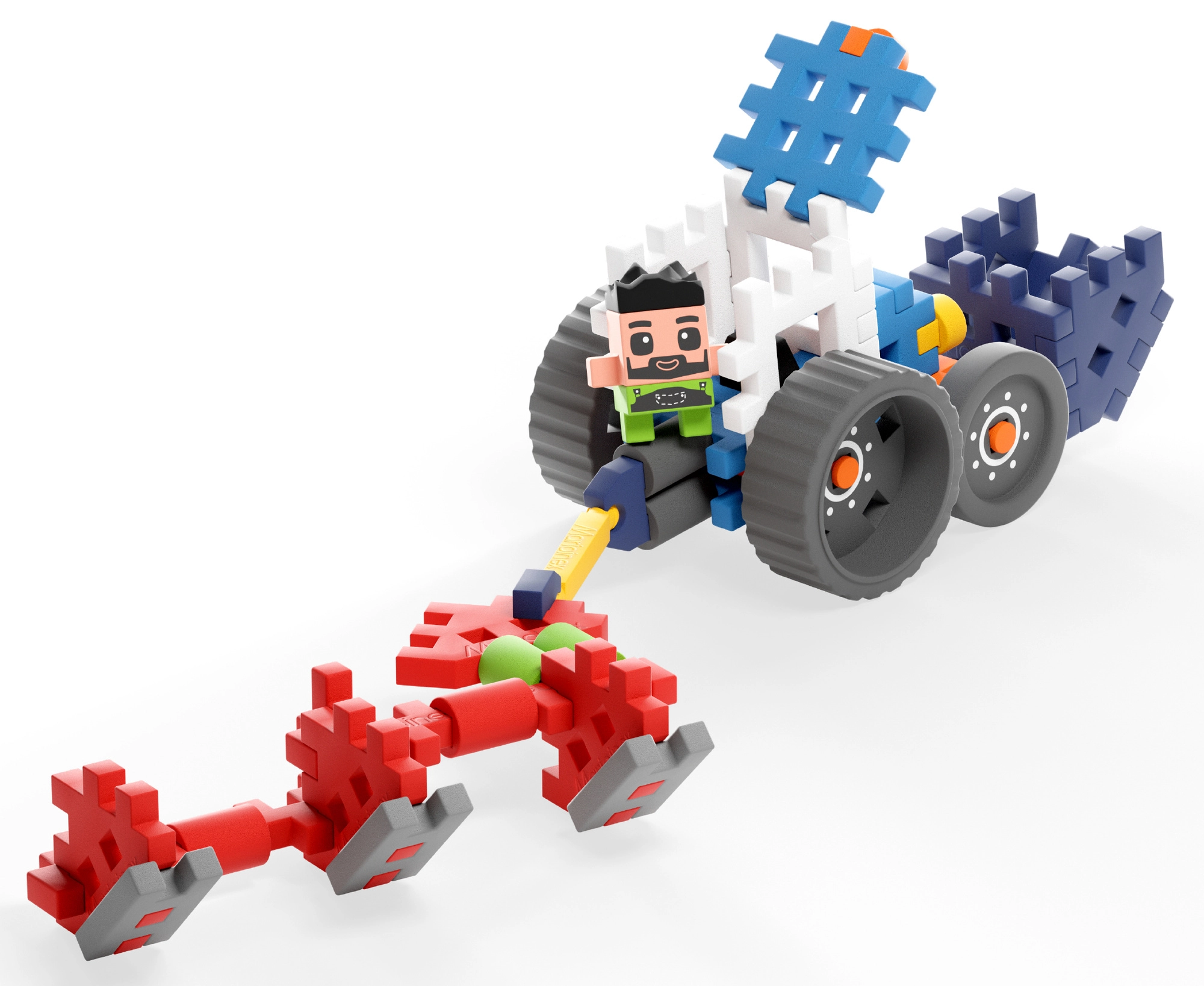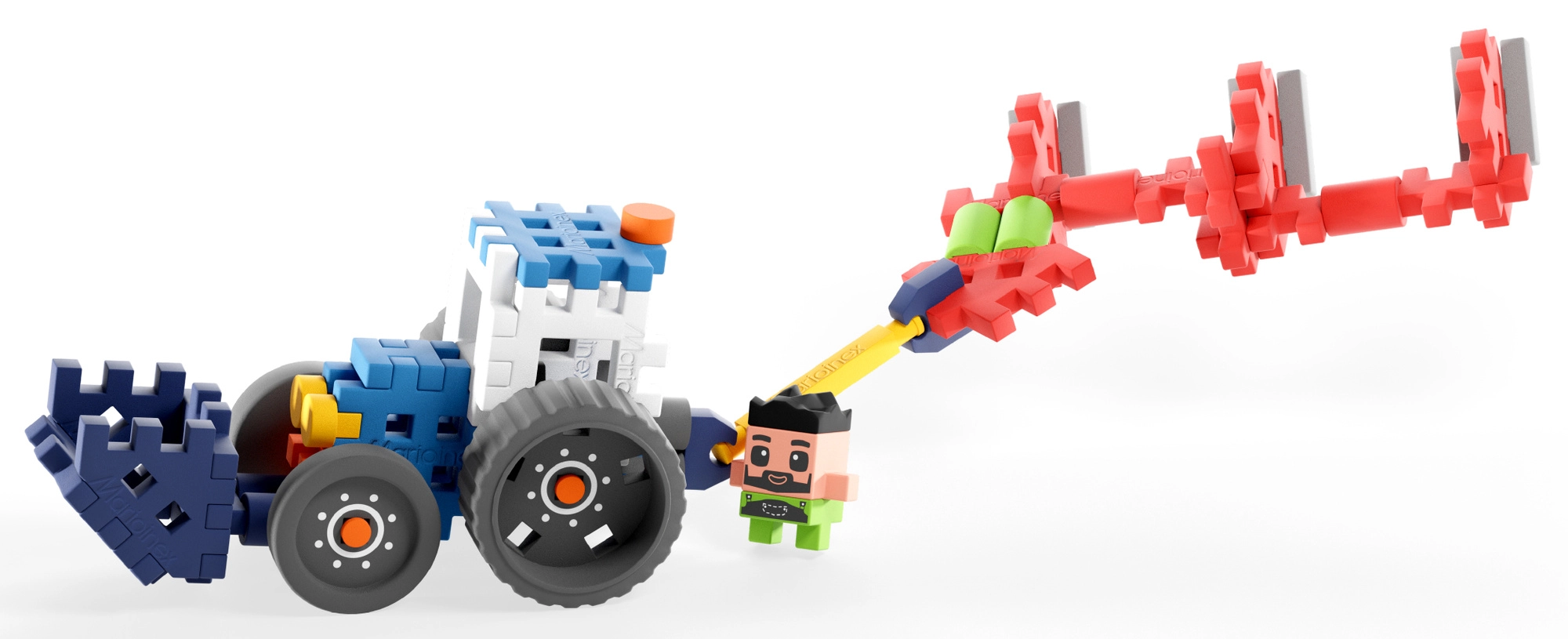 Met 50 kleurrijke en flexibele stukjes bouw je eenvoudig een tractor met een voorlader en een achterste ploeg. Het model is ideaal om mee te spelen en steeds opnieuw te verbouwen.
