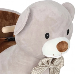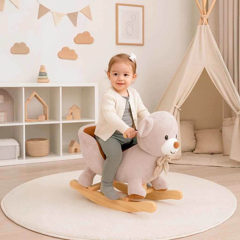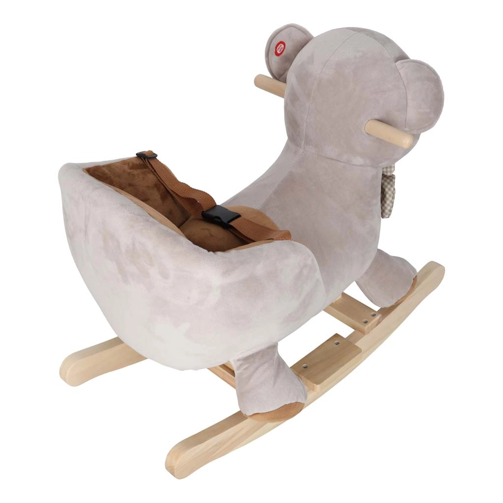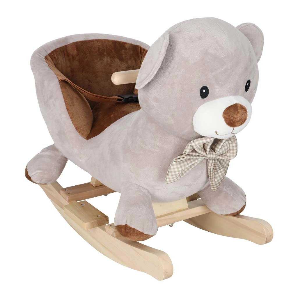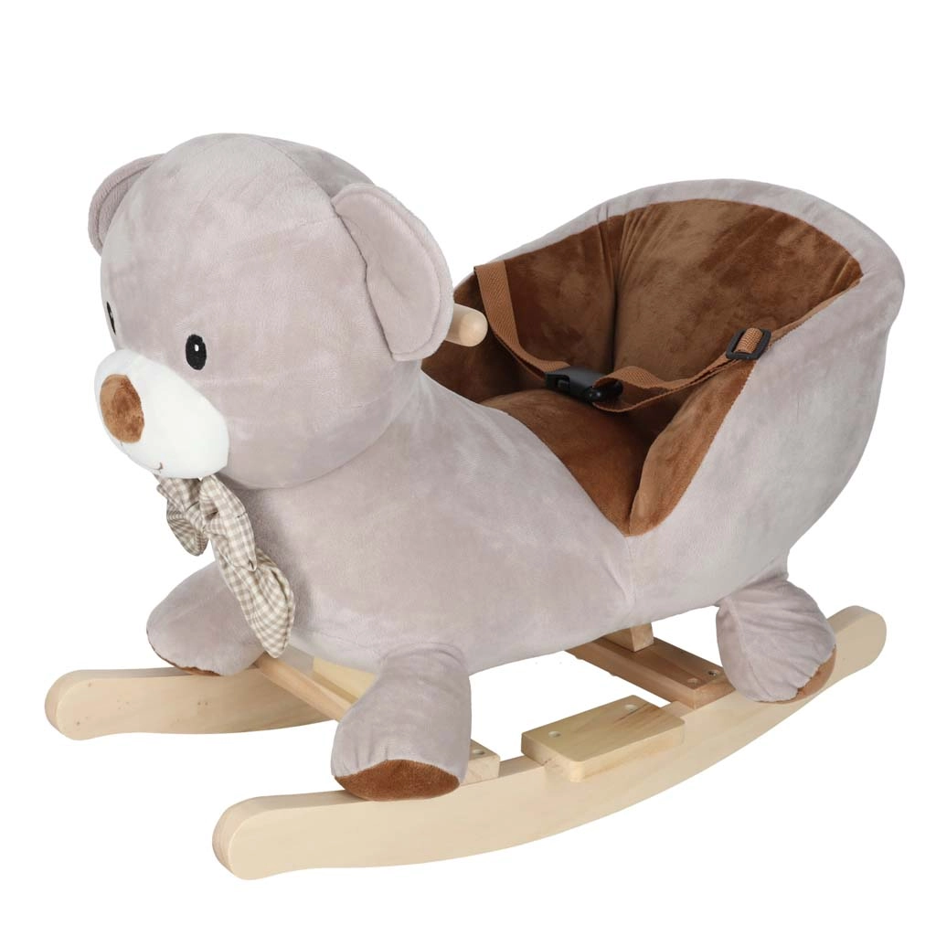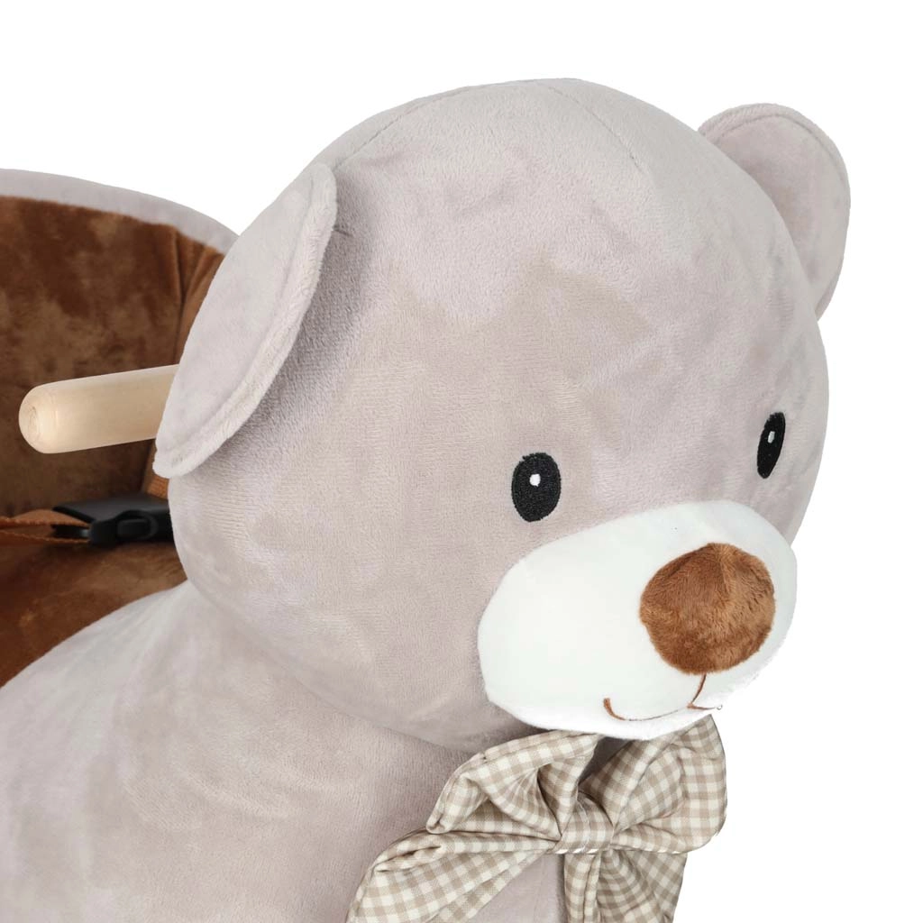 Pluche schommelende teddybeer voor kinderen vanaf 12 maanden biedt een veilige en leuke rit dankzij het zachte zitje met rugleuning, verstelbare veiligheidsgordels en stabiele houten schenkels met voetsteunen. Bij het indrukken van het linkeroortje maakt hij geluiden die de zintuigen prikkelen en het speelplezier vergroten.
