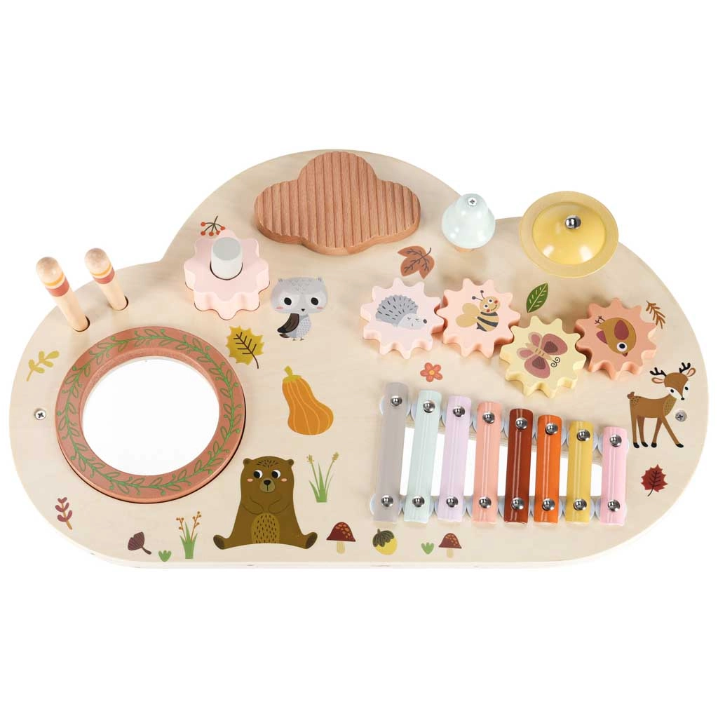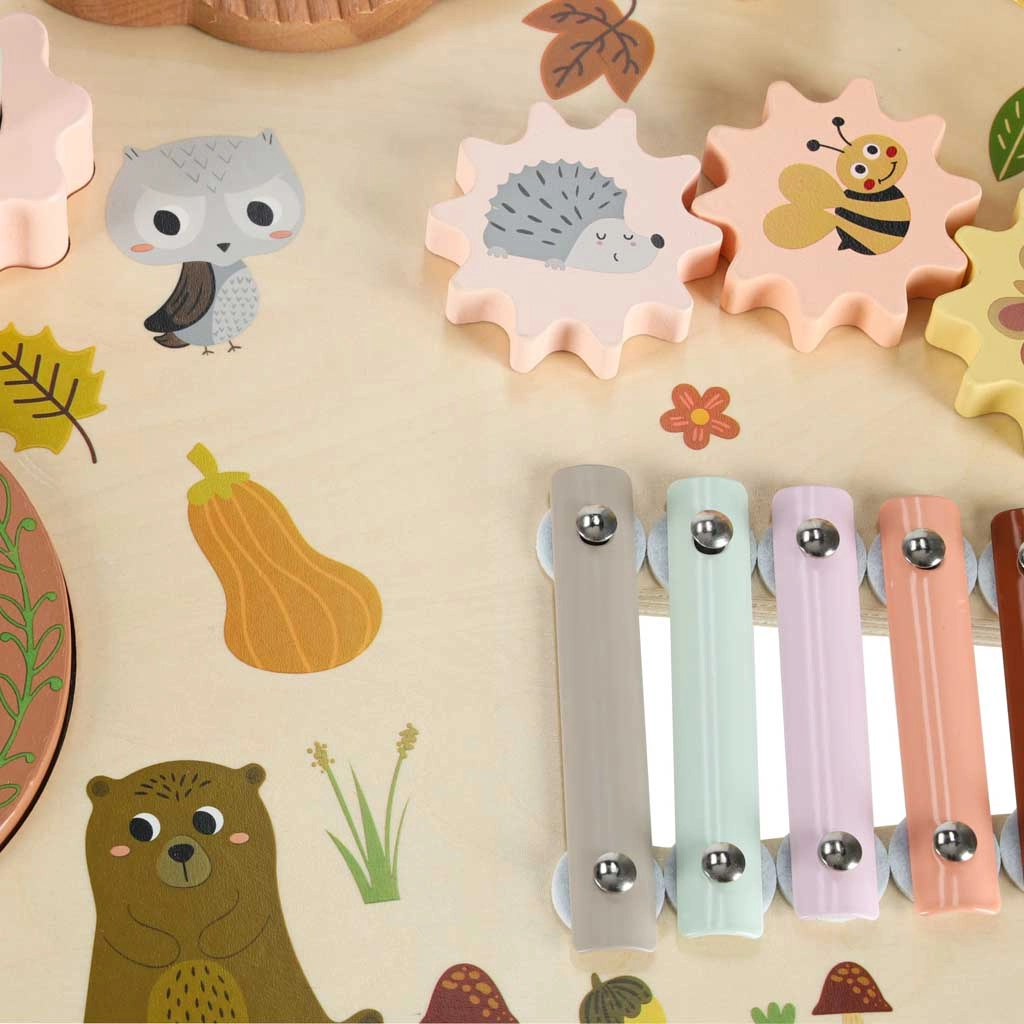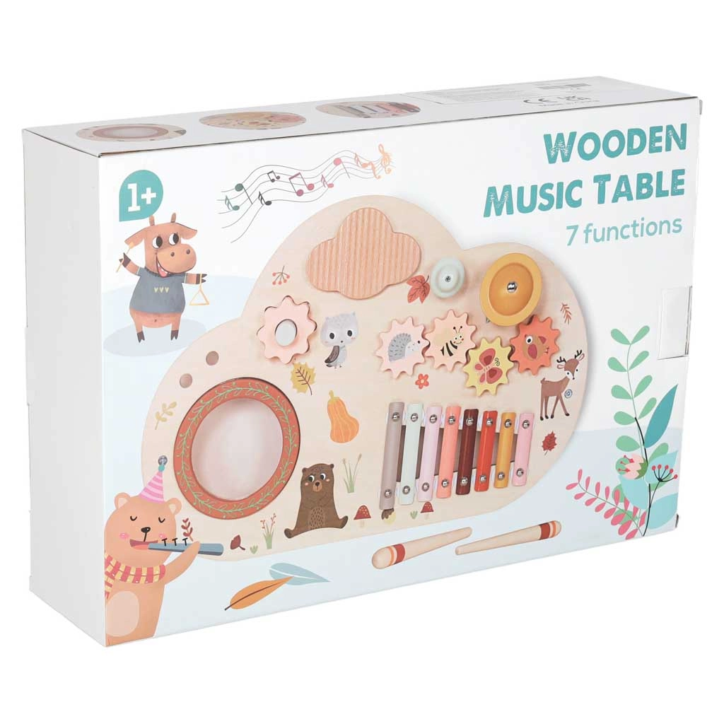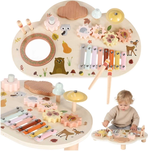 Ontdek de wereld van ritme en creativiteit met deze houten muziektafel voor de allerkleinsten. Combineert een xylofoon, trommel, bel en andere sensorische elementen voor plezier, leren en de ontwikkeling van motoriek. Dankzij de stabiele pootjes, hoogwaardig hout en het pastelkleurige design is het de ideale keuze voor de eerste muzikale ontdekkingen.