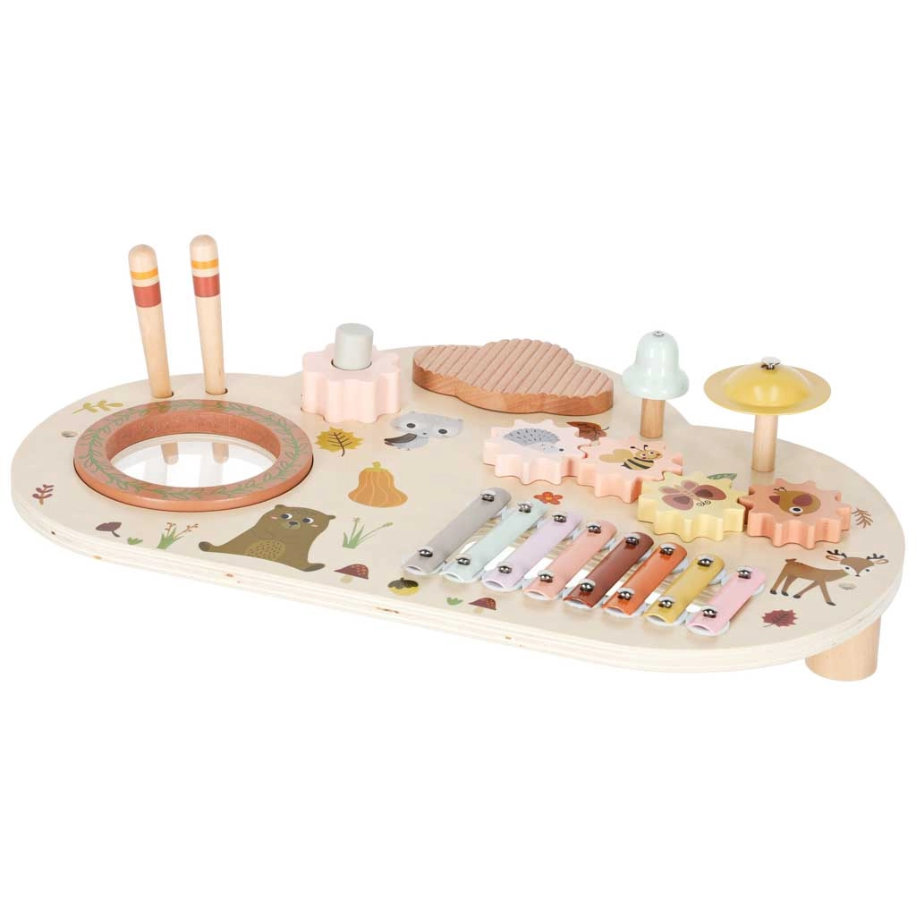 Lage pootjes en een robuust blad van natuurlijk hout zorgen voor stabiliteit bij slaan, draaien en klappen – ideaal voor peuters.