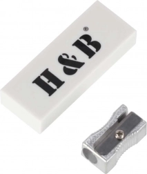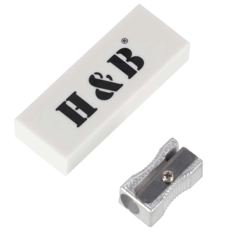 De set bevat een hoogwaardige gum en een metalen puntenslijper, zodat je altijd en overal kunt tekenen, corrigeren en slijpen.