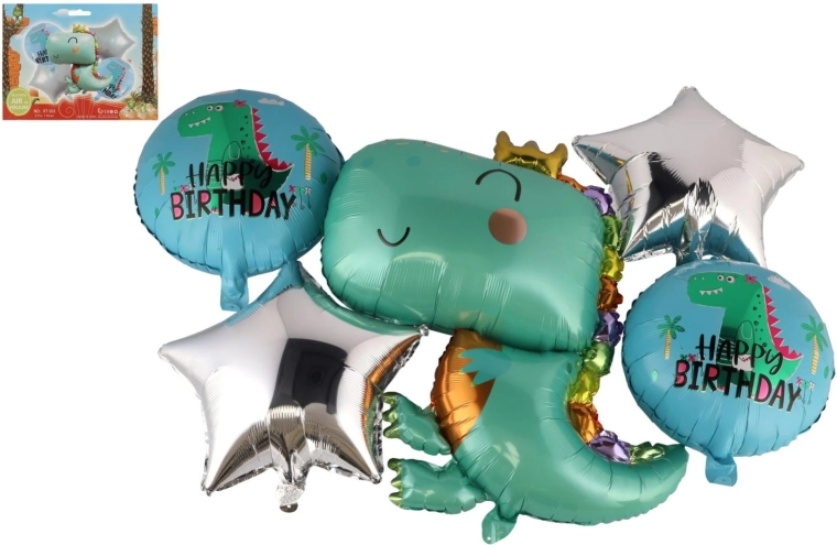Een vrolijke set verjaardagsdecoratie met dinosaurusmotief die elke kleine jarige blij maakt. De set bevat 5 ballonnen in verschillende vormen – een schattige dinosaurus met kroon, ronde ballonnen met de tekst Happy Birthday en twee sterren. De ballonnen kunnen worden gevuld met lucht of helium en zijn ideaal als decoratie voor een kinderfeestje.