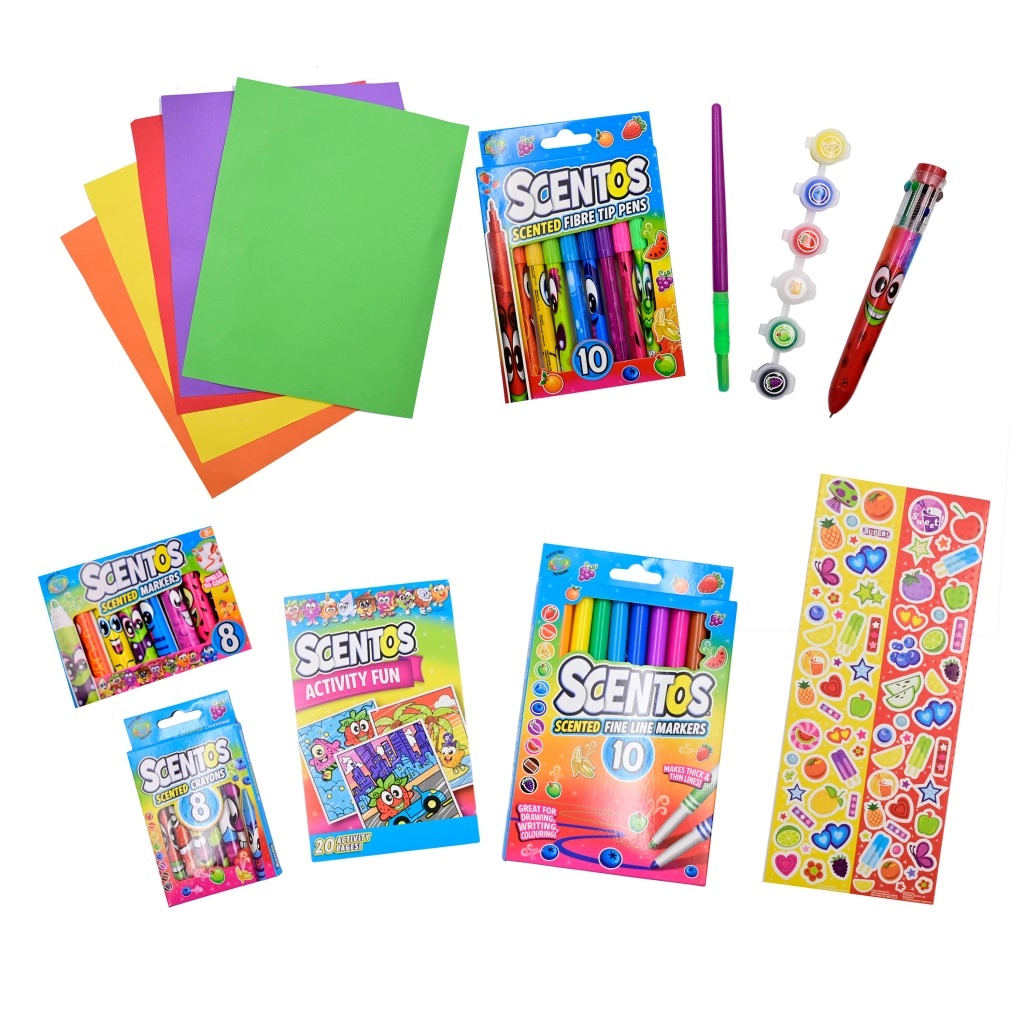 10 geurige stiften met fijne punt, 10 stiften met vezelpunt, 8 geurige kleurpotloden, 8 waskrijtjes, palet met 6 plakkaatverven, klein penseel, themastickers, gekleurde vellen papier (5 kleuren)