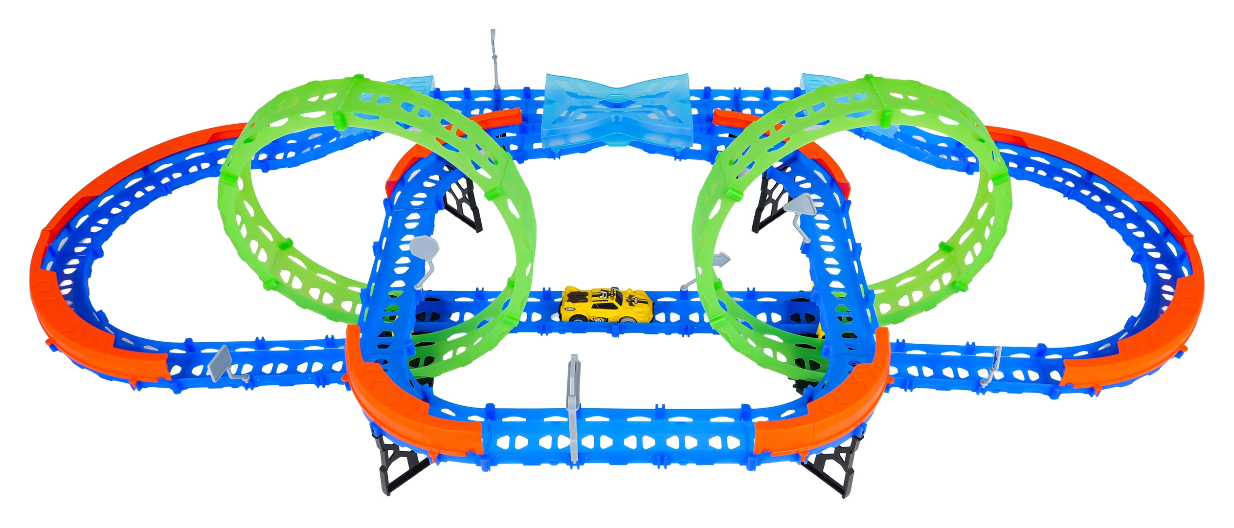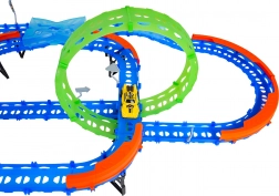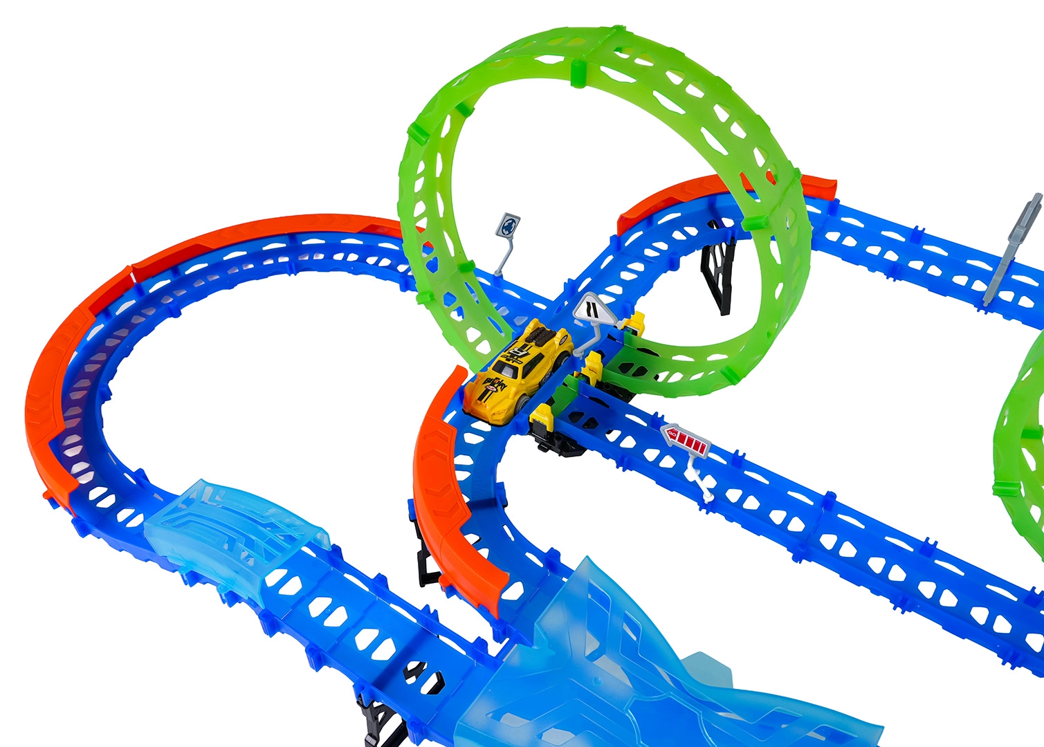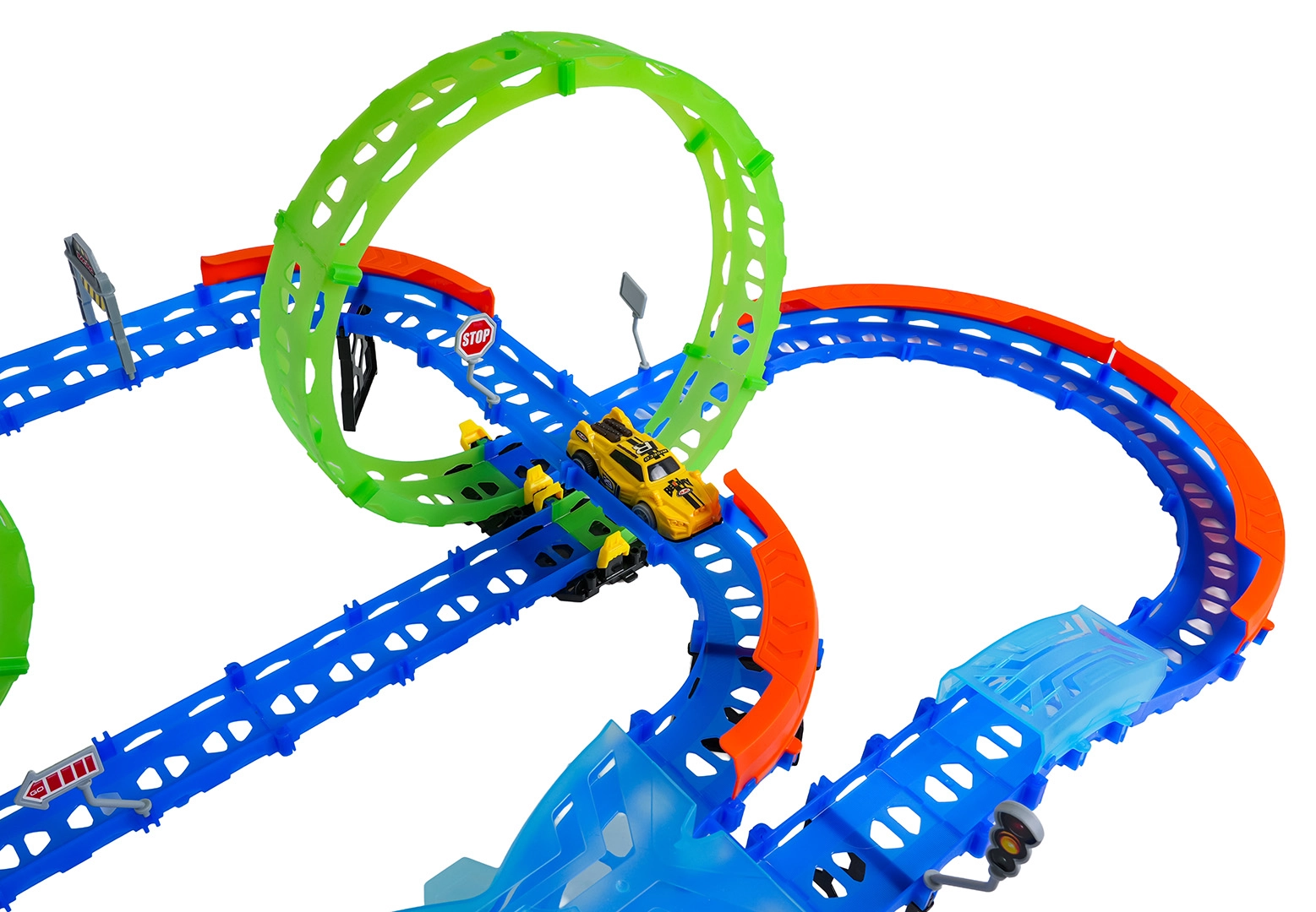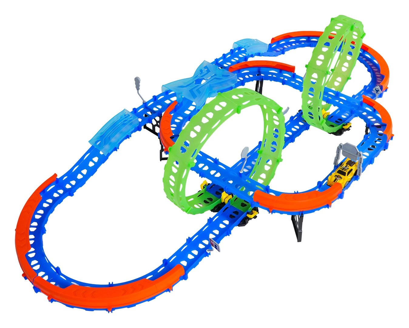 Bouw een kleurrijke baan met bruggen, bochten en twee loops en kijk hoe het autootje met hoge snelheid voorbij zoeft. De fluorescerende elementen lichten op in het donker na belichting, waardoor de races nog actieger en leuker worden.