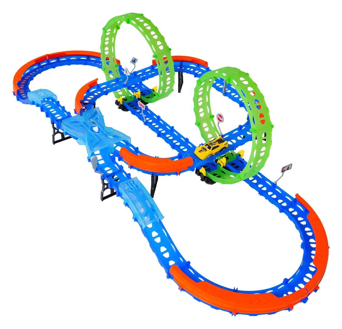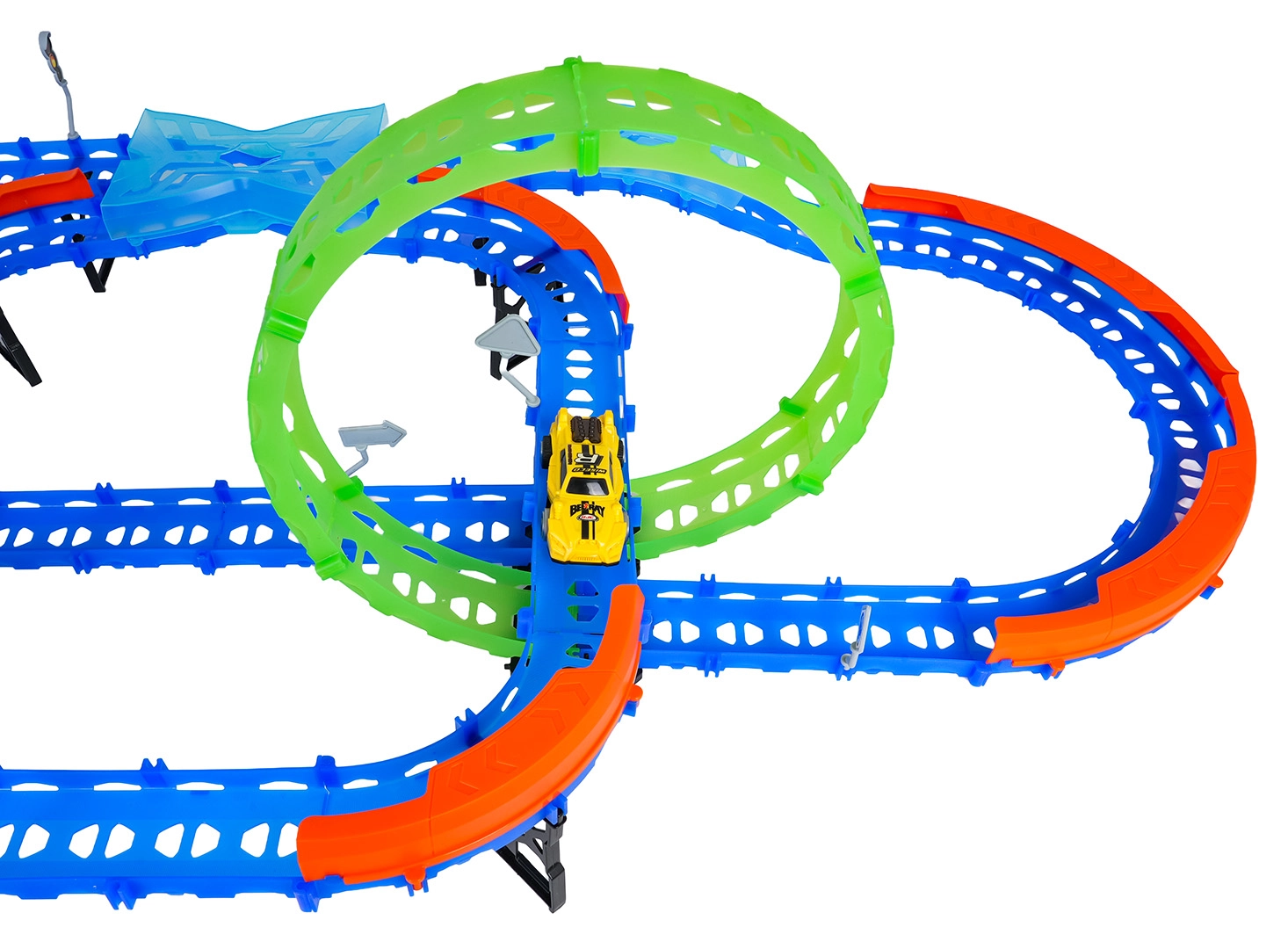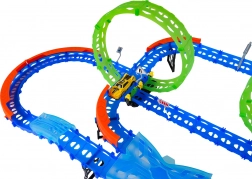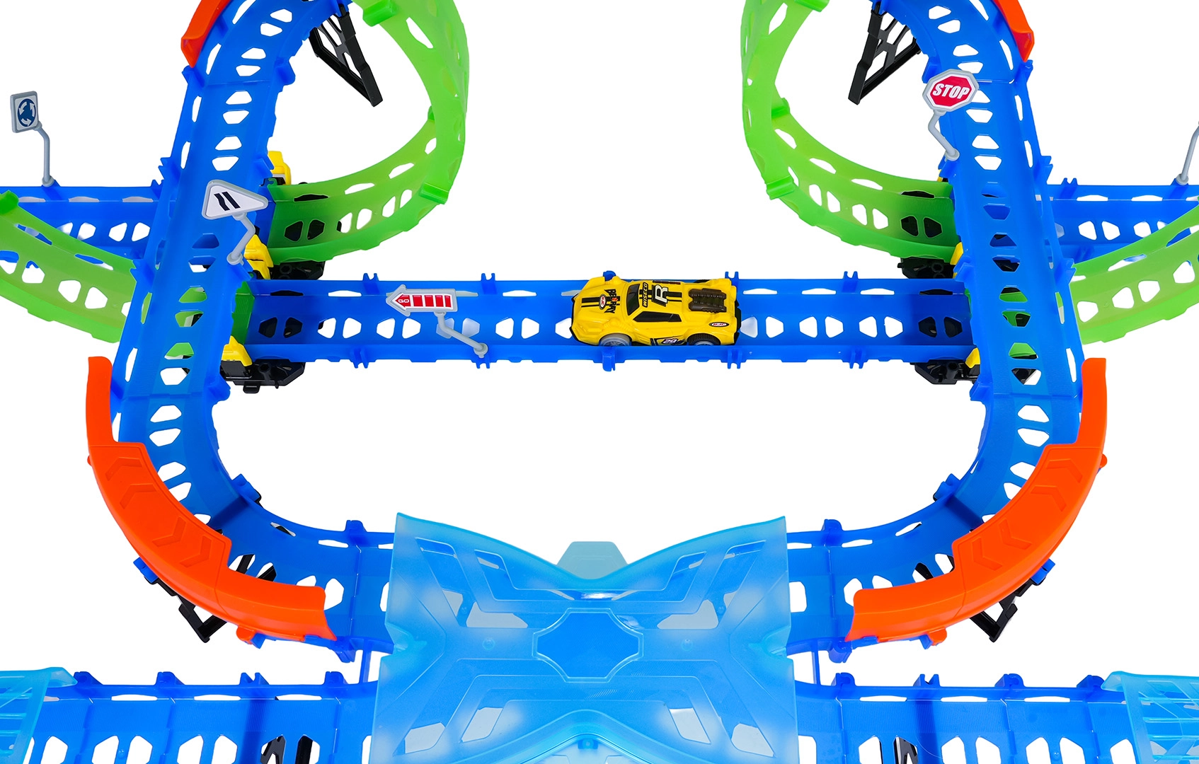 Bouw een kleurrijke baan met bruggen, bochten en twee loops en kijk hoe het autootje met hoge snelheid voorbij zoeft. De fluorescerende elementen lichten op in het donker na belichting, waardoor de races nog actieger en leuker worden.